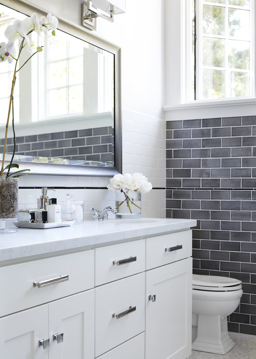 White and light-coloured bathrooms are lovely, but there is something to be said for black and deep grey walls. While many people believe black walls will close a room in, black paint can actually visually blur the boundary lines to make a room seem larger. Low-sheen black walls can also hide imperfections in older homes.