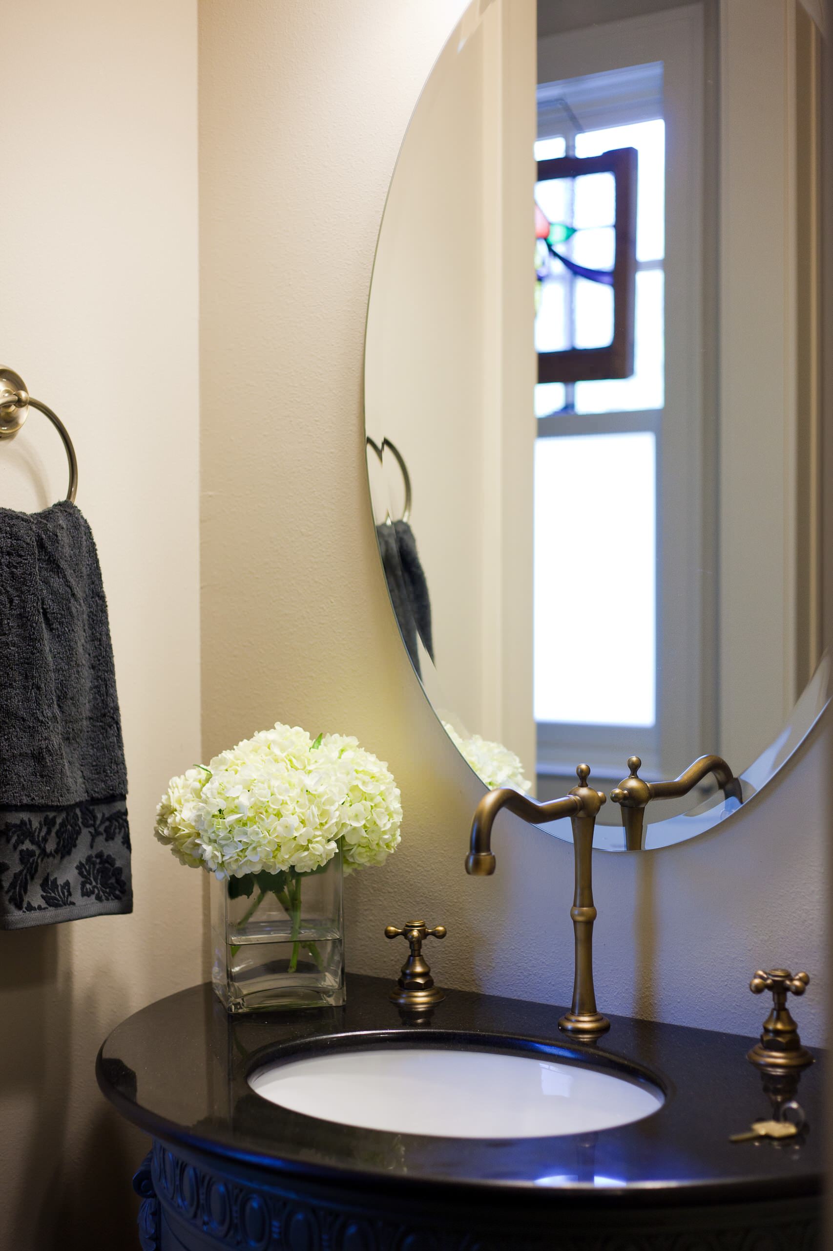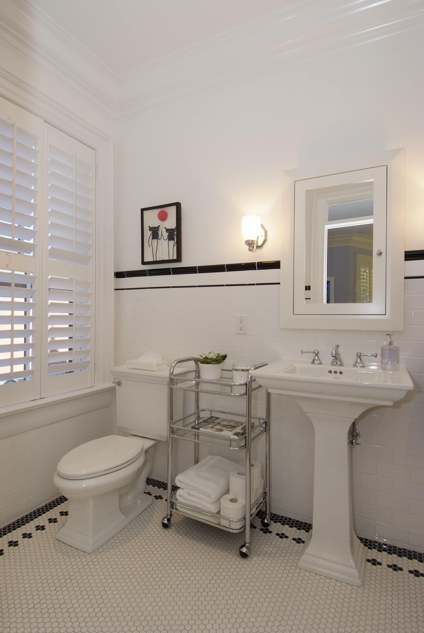If your bathroom has the space, look at adding a statement piece of furniture. This classic bathroom is taken to the next level with an antique dresser that offers lots of storage.