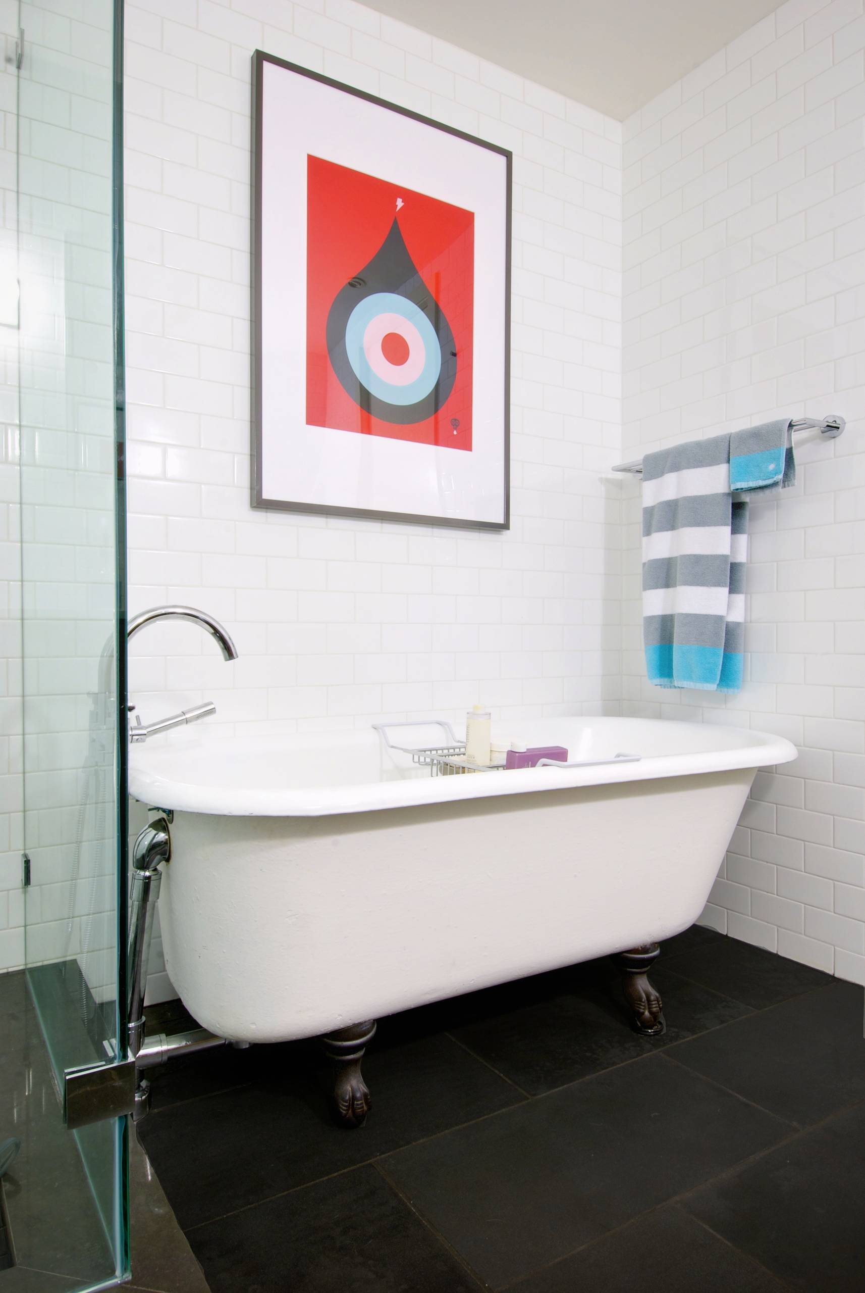 So often we don’t even think of the bathroom when it comes to considering artwork for the home, yet there’s no reason we shouldn’t take our bathrooms into account. In this simple bathroom, a colourful eye-catching print modernises the room and adds a fun, funky edge.