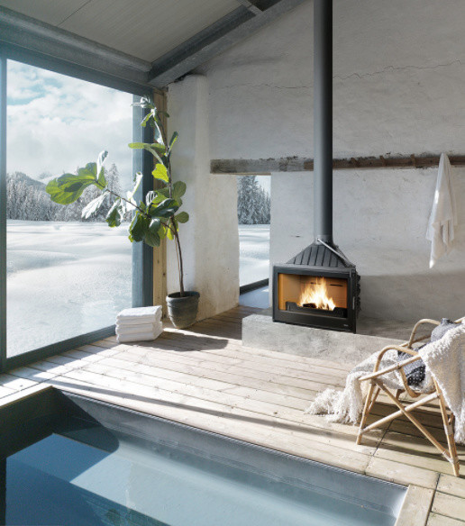 Tip: If you are looking to increase the efficiency of an old hearth, a good option is to use an insert, which is fitted into an existing fireplace. As with all types of fireplaces, inserts can be enclosed, like the freestanding stove pictured above, or open, like the suspended fireplace below.