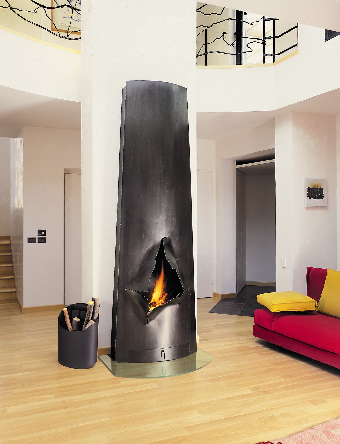 Larger freestanding ethanol fireplaces with specified safety features and warnings are still allowed, however, and many models – including the artistic raw steel fireplace pictured here – are also available in wood- and gas-burning versions. Ethanol fireplaces are better suited as features than heaters as they are far less efficient than wood, gas or electric options.