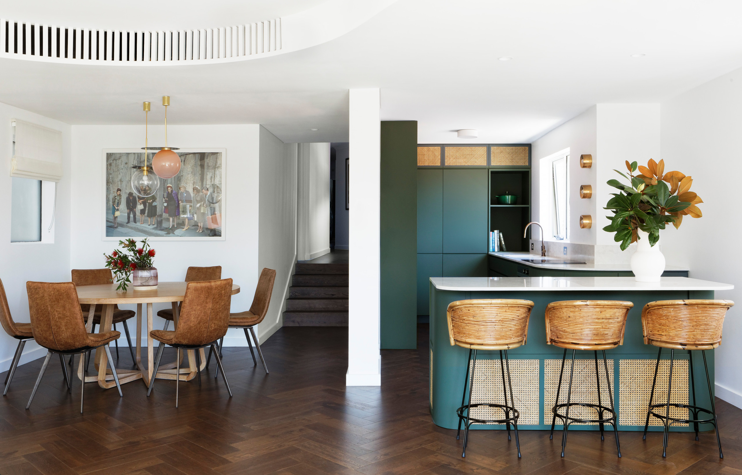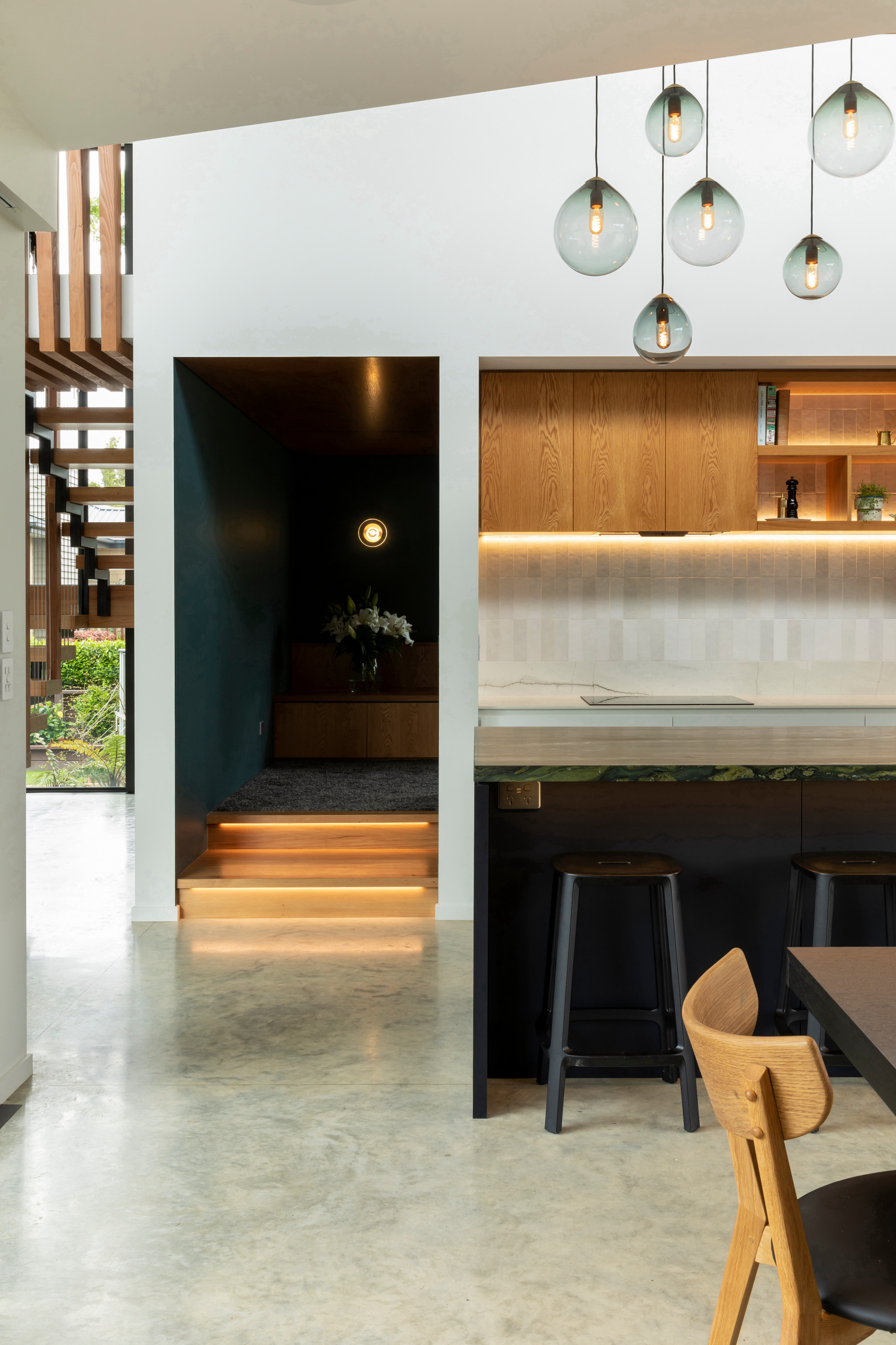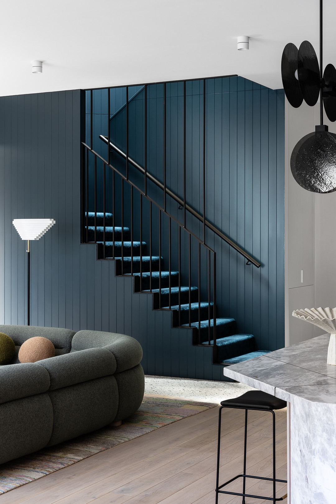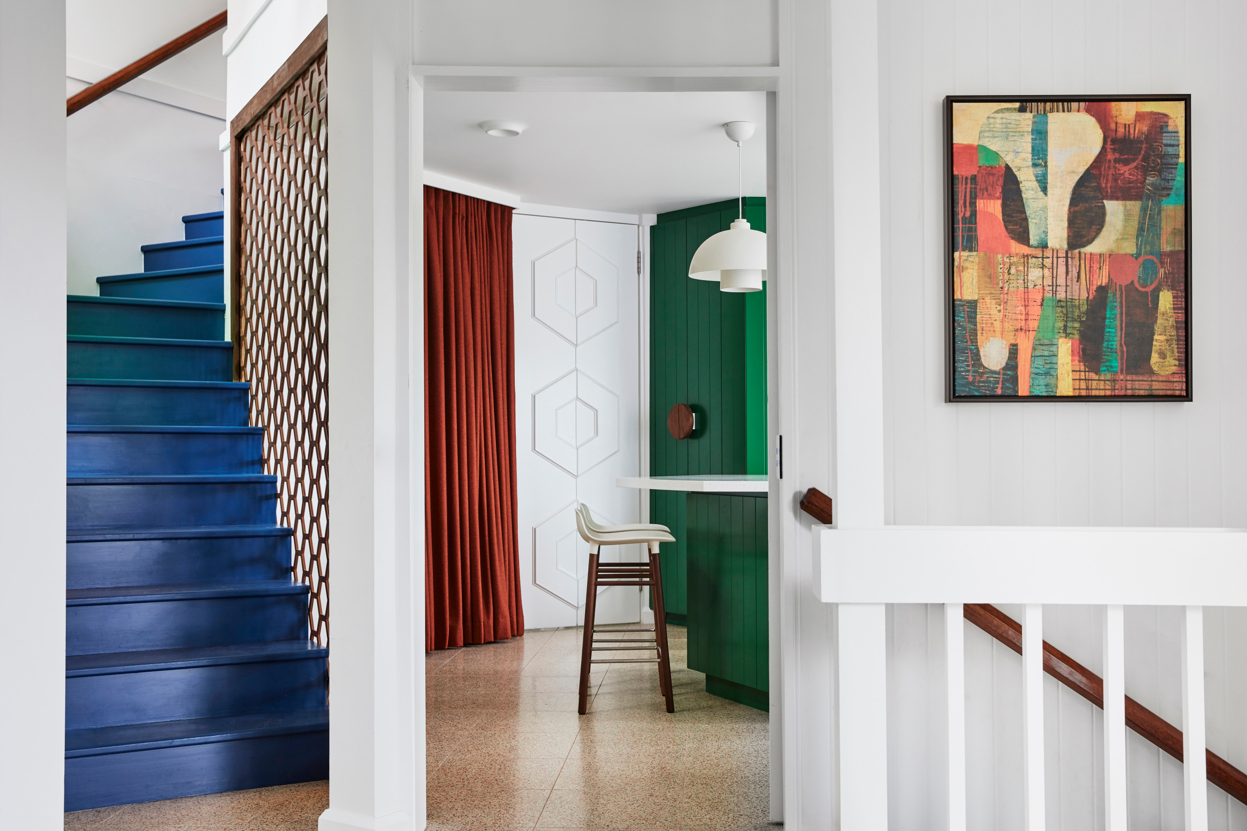 Stairs in Dulux Night Life; kitchen in Dulux Billiard Ball.