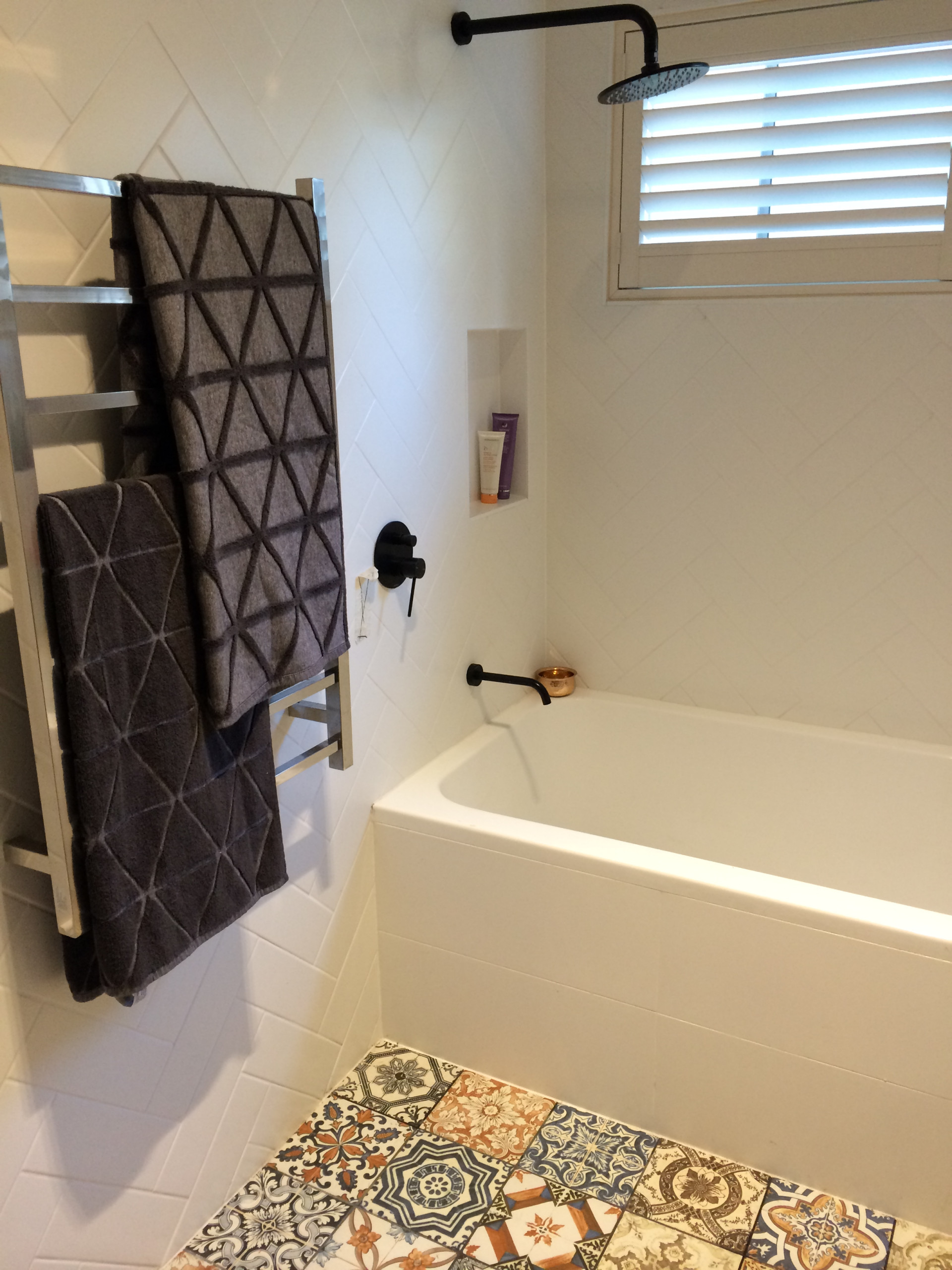 When decorating with patchwork tiles, the rest of the bathroom doesn’t have to be devoid of pattern altogether. Complementing towels displaying geometric designs will add a modern twist to the eclectic flooring.