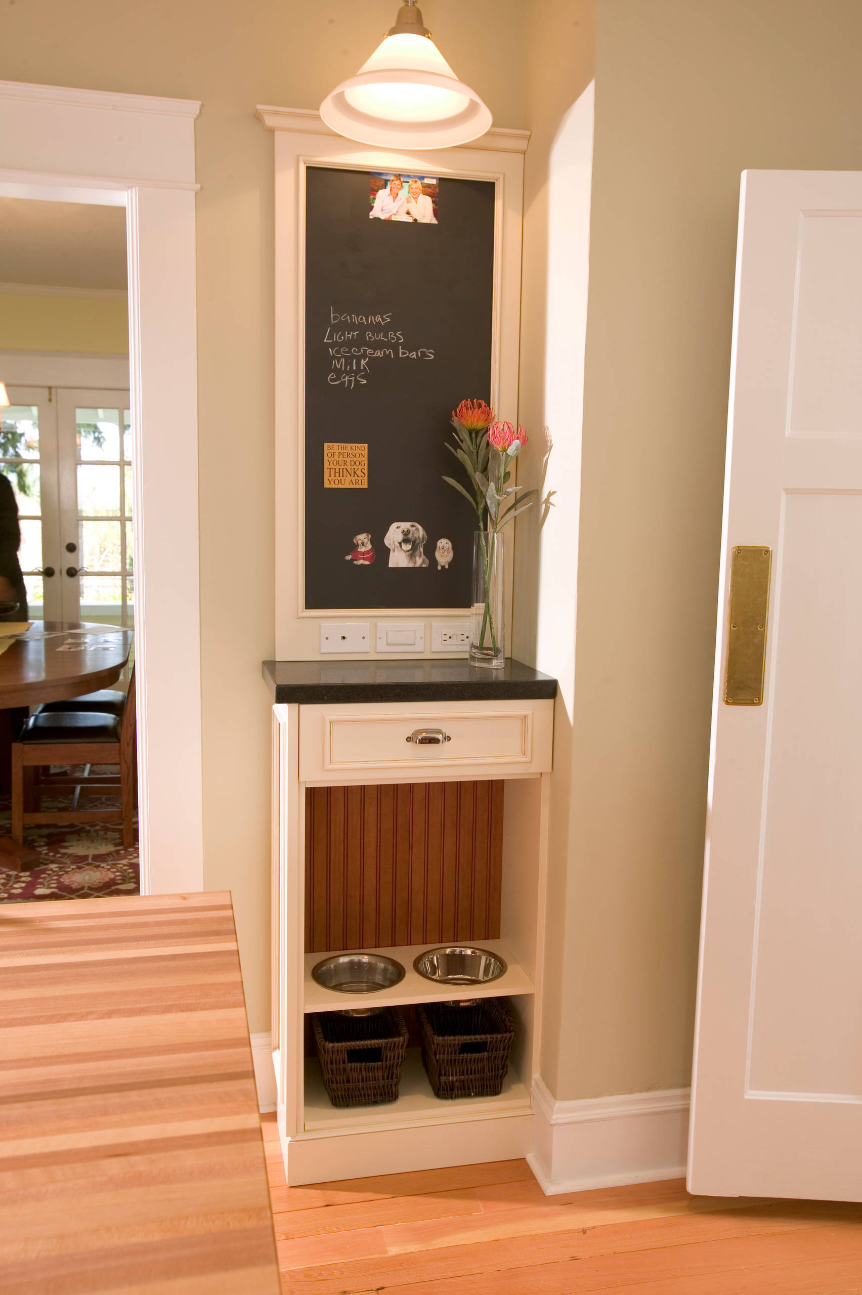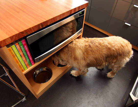 Some smart and space-endowed homeowners take the dog dishes farther from the kitchen triangle. In this project, by Kathleen Donohue, Neil Kelly, the eating area is under the command centre.