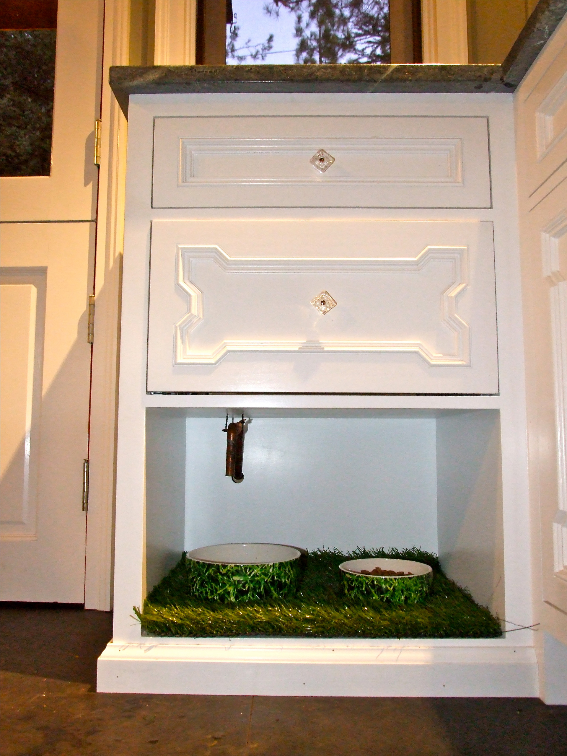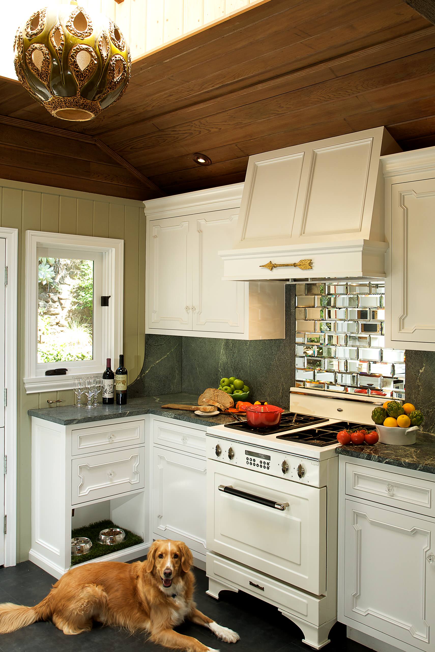 The designers at Haddad Hakansson employed a similar strategy in this kitchen, but they placed the bowls at the end of a cabinet run as opposed to an island. It’s a smart move in a kitchen that has the room. “One of the highlights of this space is the custom dog dishes,” the designers write. They are “inset into a small slab of white quartzite. The cabinet above has a tilt-out tray for dog treats.”
