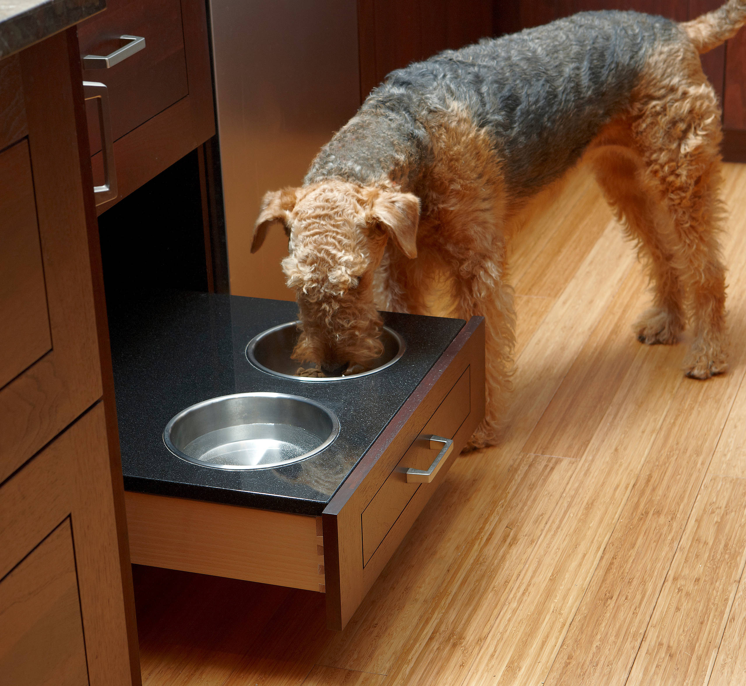 In this project, by Anthony Wilder Design/Build, an eating and storage area for the dog is tucked into the end of a wall. Below are the bowls; above are dog accessories and treats.