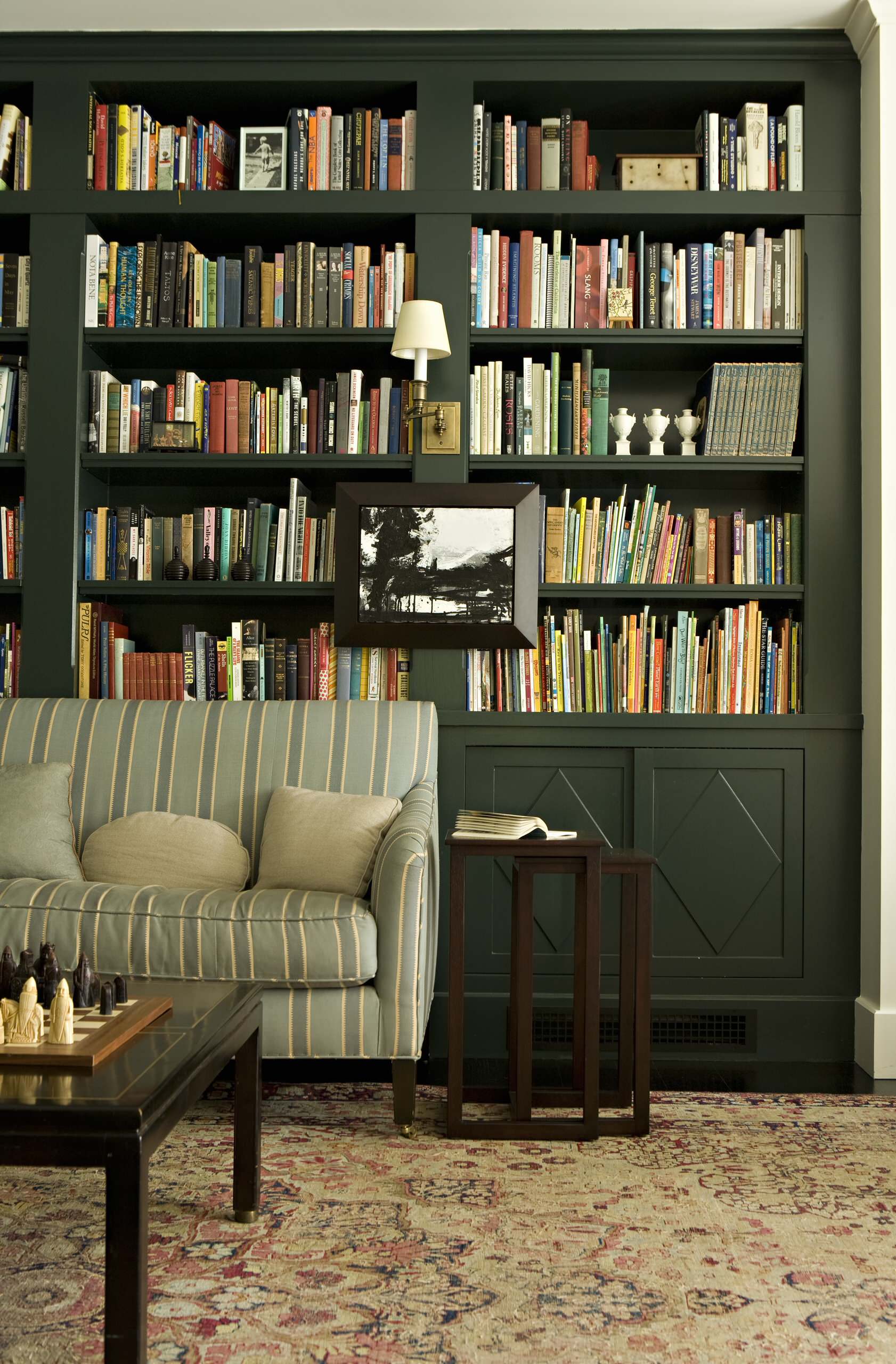 With oriental rugs, don’t worry about matching – they go with everything! In this example the dark painted bookcases and dark wood tables create a more formal feel.