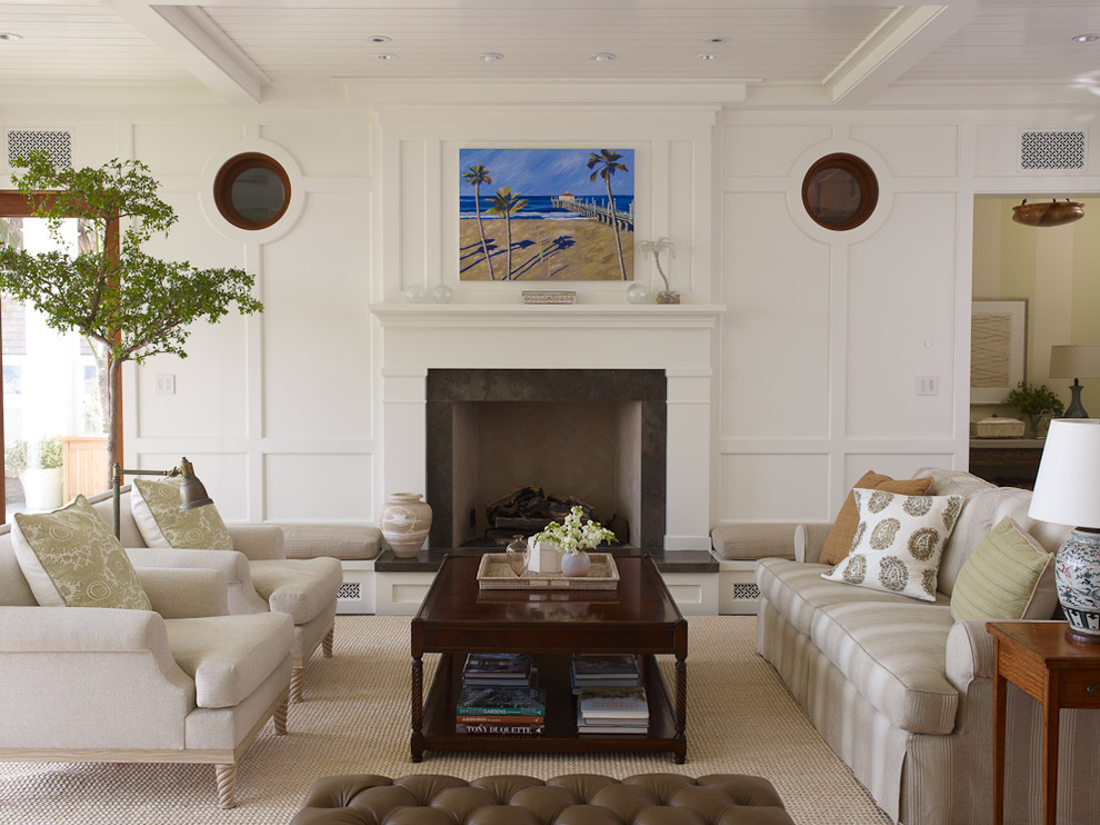 You can’t miss with a pair of armchairs upholstered in natural linen and a light rug. Mixing patterns with the throw pillows brings a bit of interest to the room, but keeping them in the neutral range means they will all go effortlessly together.
