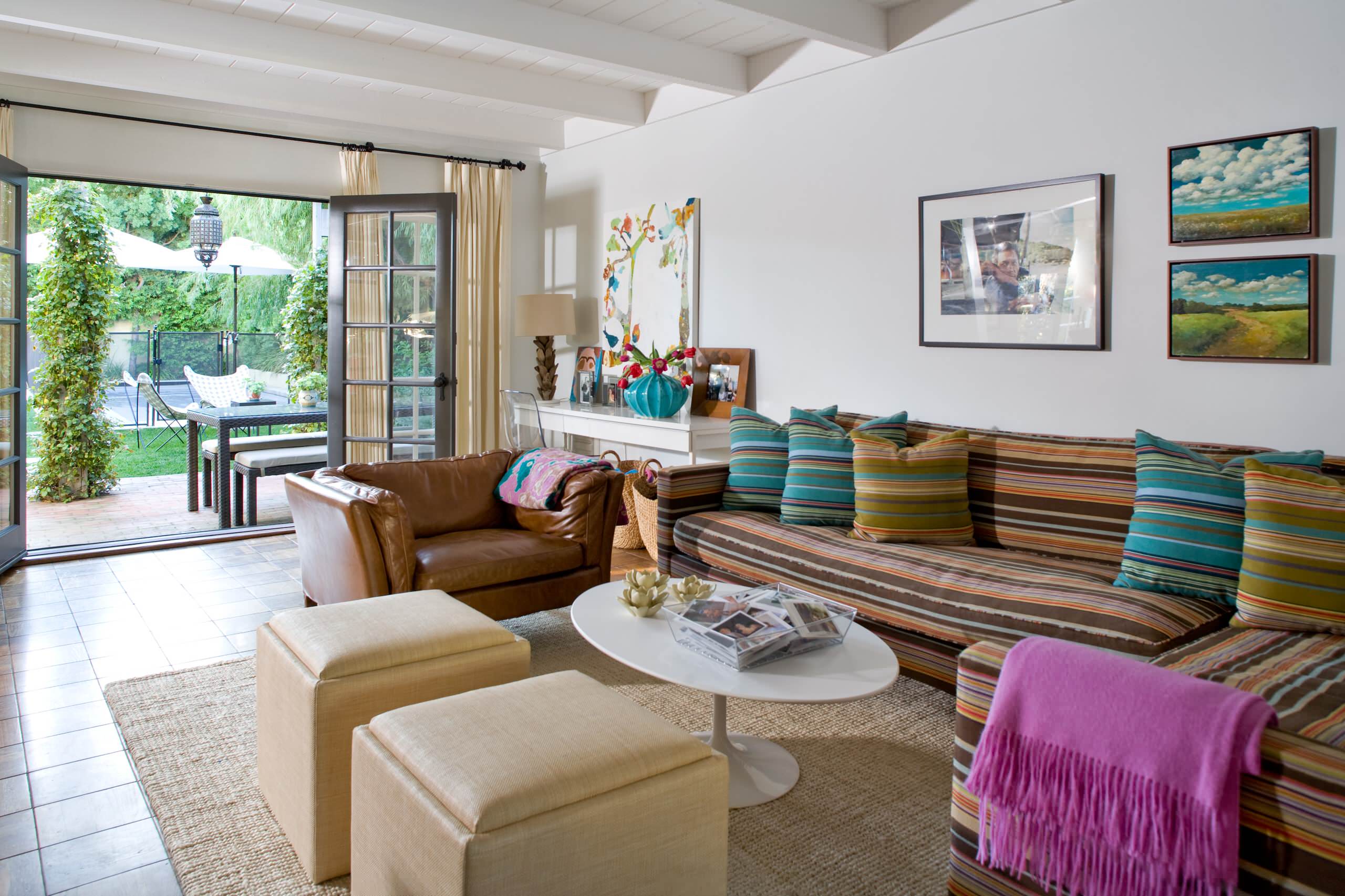 The weight and texture of a fabric is key – choosing a similar type of fabric for accent cushions, poufs and chairs can help make your striped sofa fit in. For example, in the space shown here, a rough, textured striped sofa is accented with a few equally nubby cushions and a kilim pouf. If you have a fine linen sofa, try pairing it with cotton voile pillows; a velvet sofa would call for something thick and luxurious, such as wool (or more velvet).