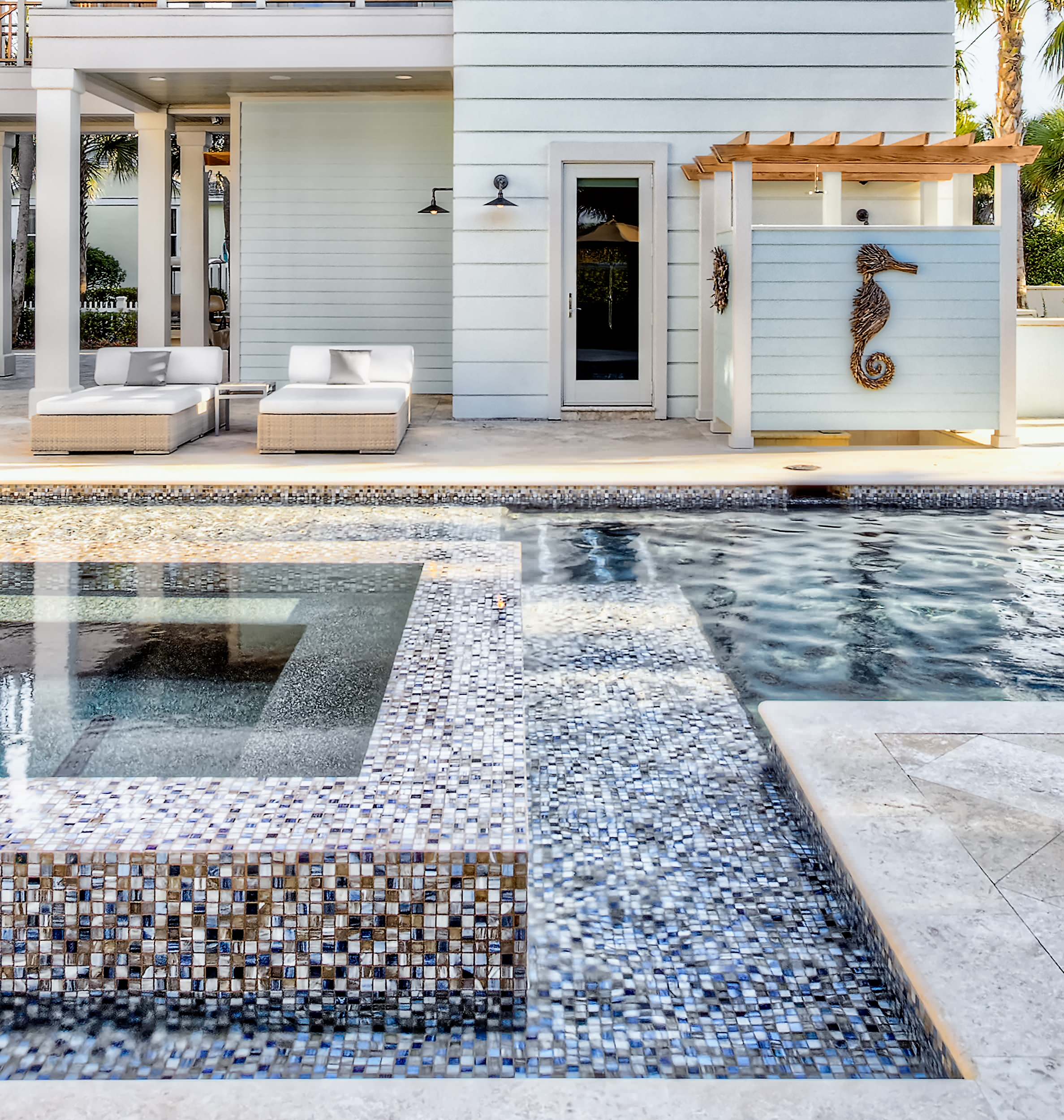 This glass mosaic longboard conceals plumbing and creates a tropical backdrop for showering.