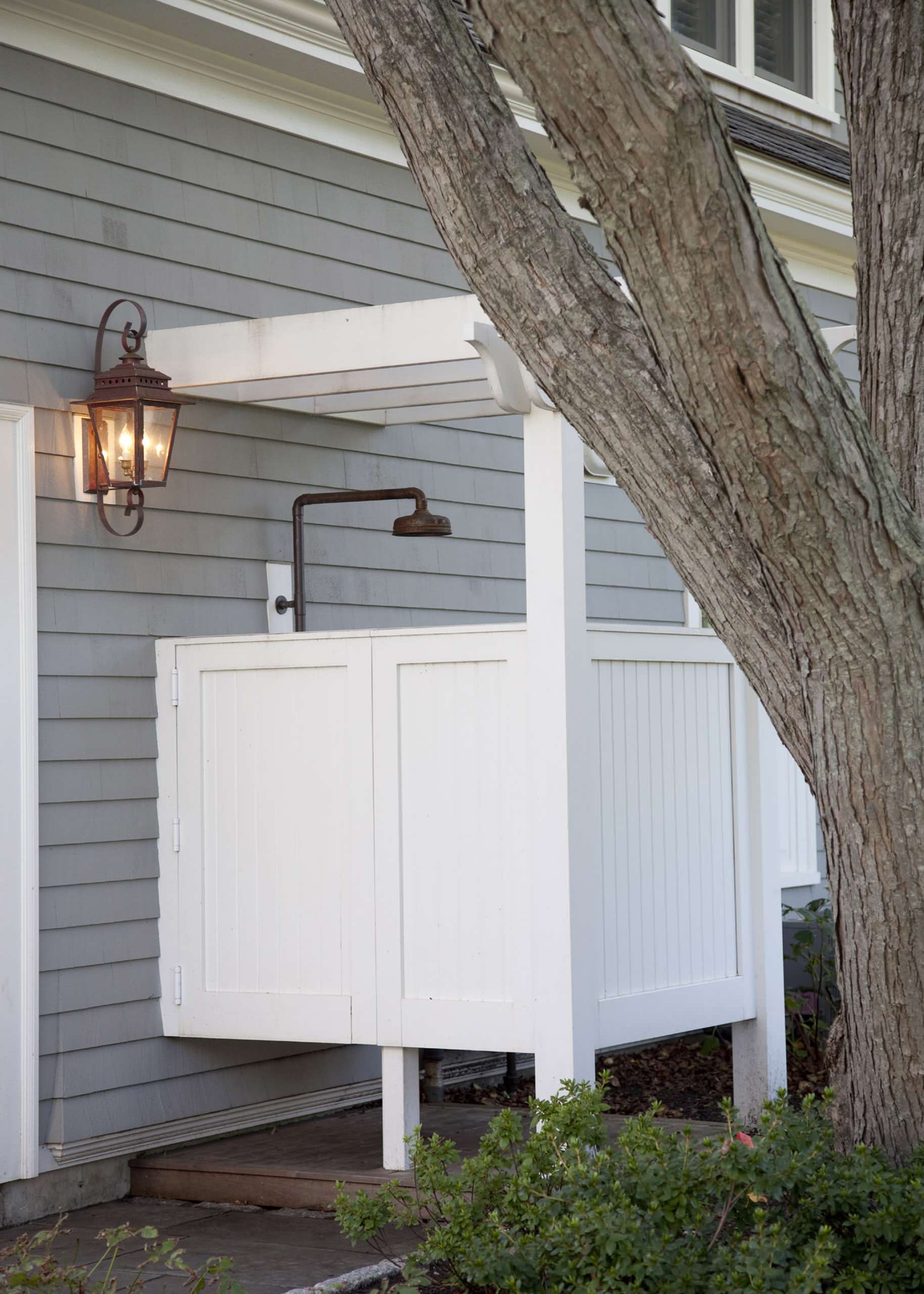 A pergola overhead, a paint colour that matches the home’s trim and a showerhead with a similar finish to that of the outdoor lantern all make this outdoor shower part of the house.