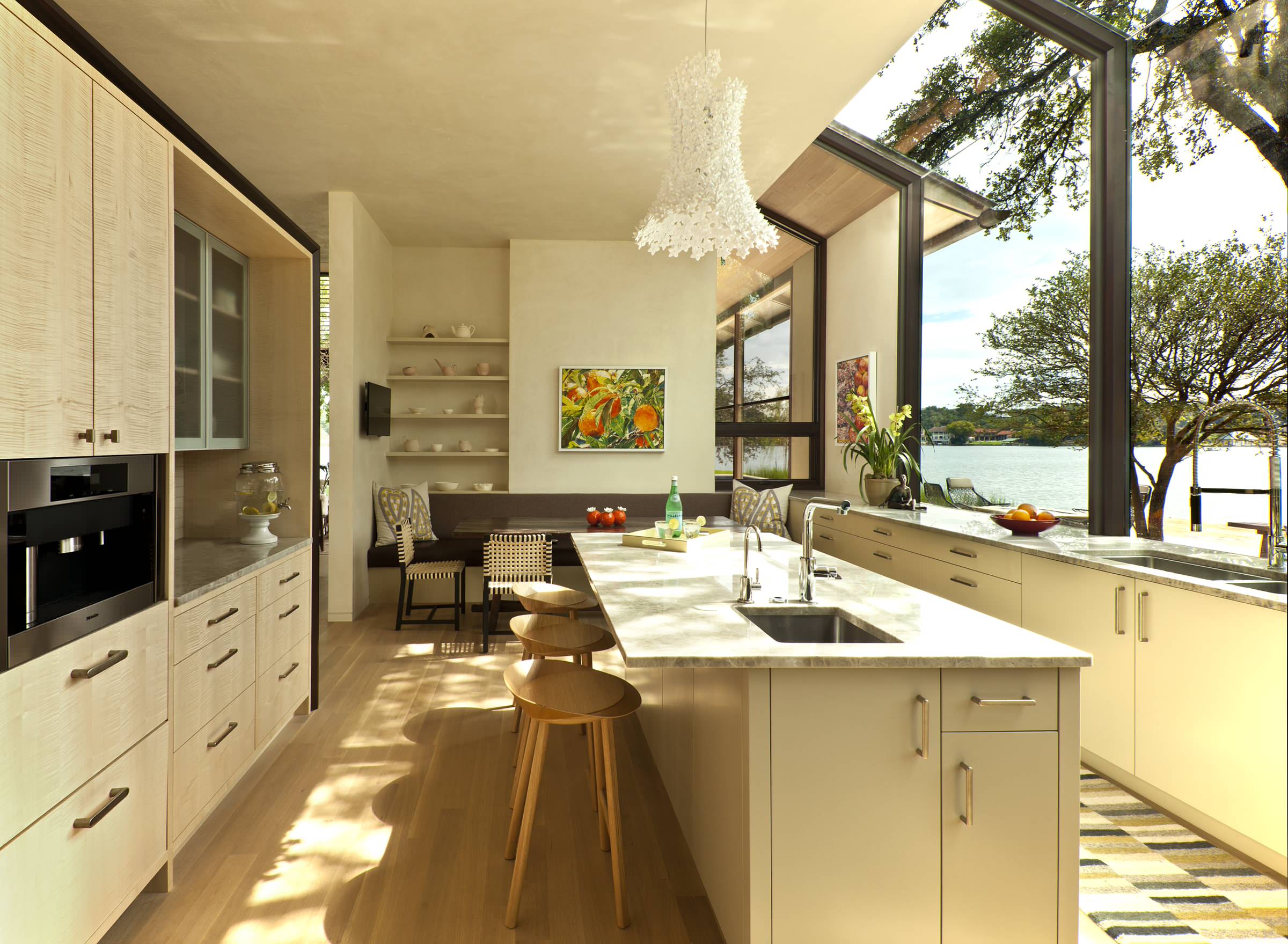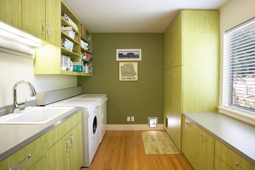 This laundry is a dream come true for a cat owner and cat alike. By day, the cat can come and go as it pleases through an artfully placed cat flap in the wall. By night, with the cat flap closed, the birds can rest safely in their trees knowing the cat is in until morning. The kitty litter tray is tucked away out of sight in the cupboard near the cat door.