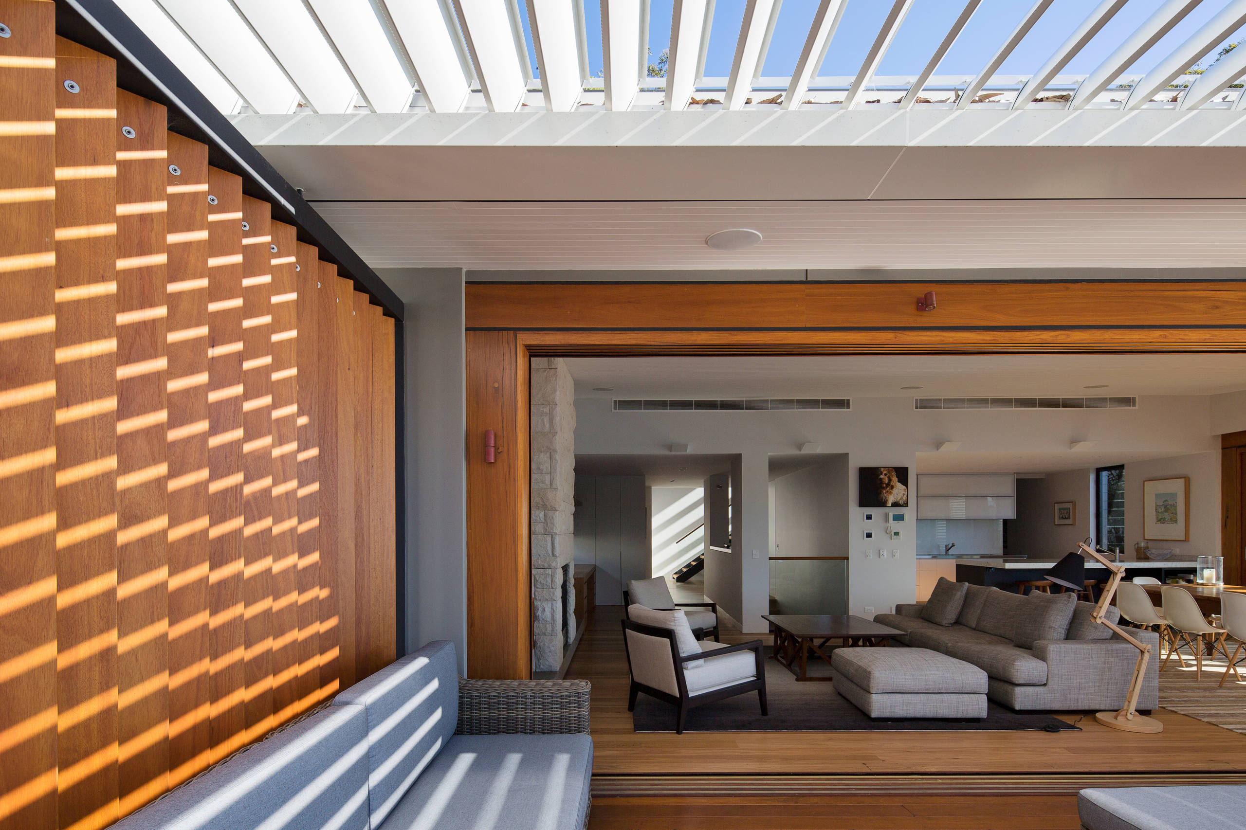 A series of slatted external privacy screens, such as the ones on this inner-city Sydney home, allows the upstairs rooms, including the master bedroom, to be totally shielded from view while still letting in ample light through the slats.