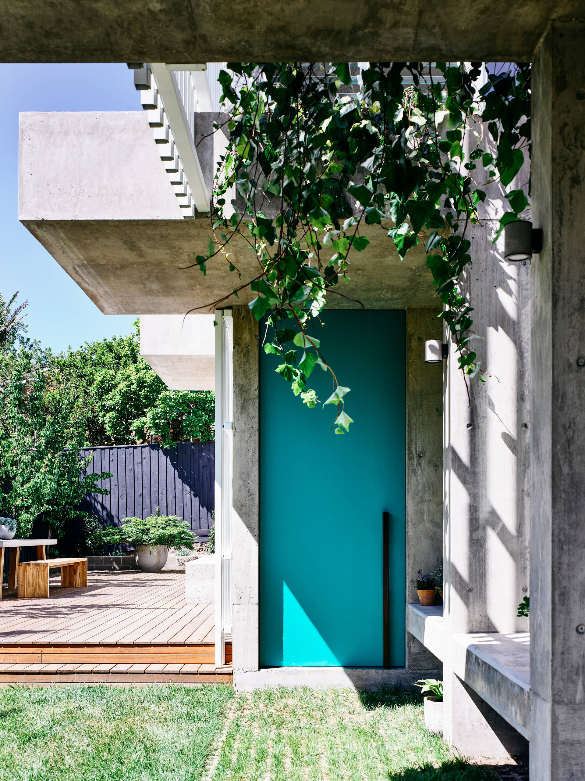 “The green entry door is a reference to [Le Corbusier’s] Chandigarh High Court and how it juxtaposes against the raw concrete, while the blue gate at the street is more of Corbusier’s earlier works in France, such as Poissy and Marseille.”