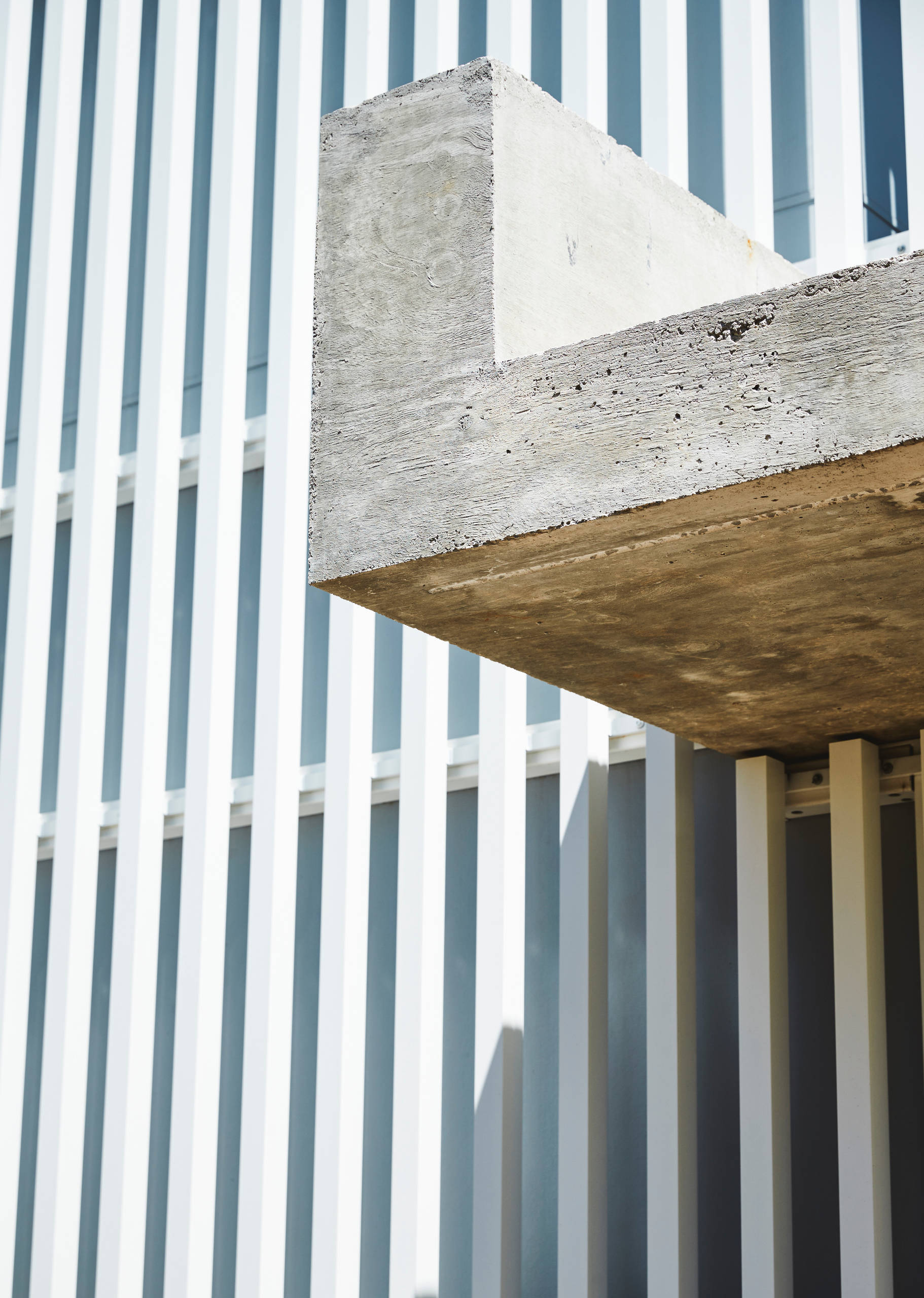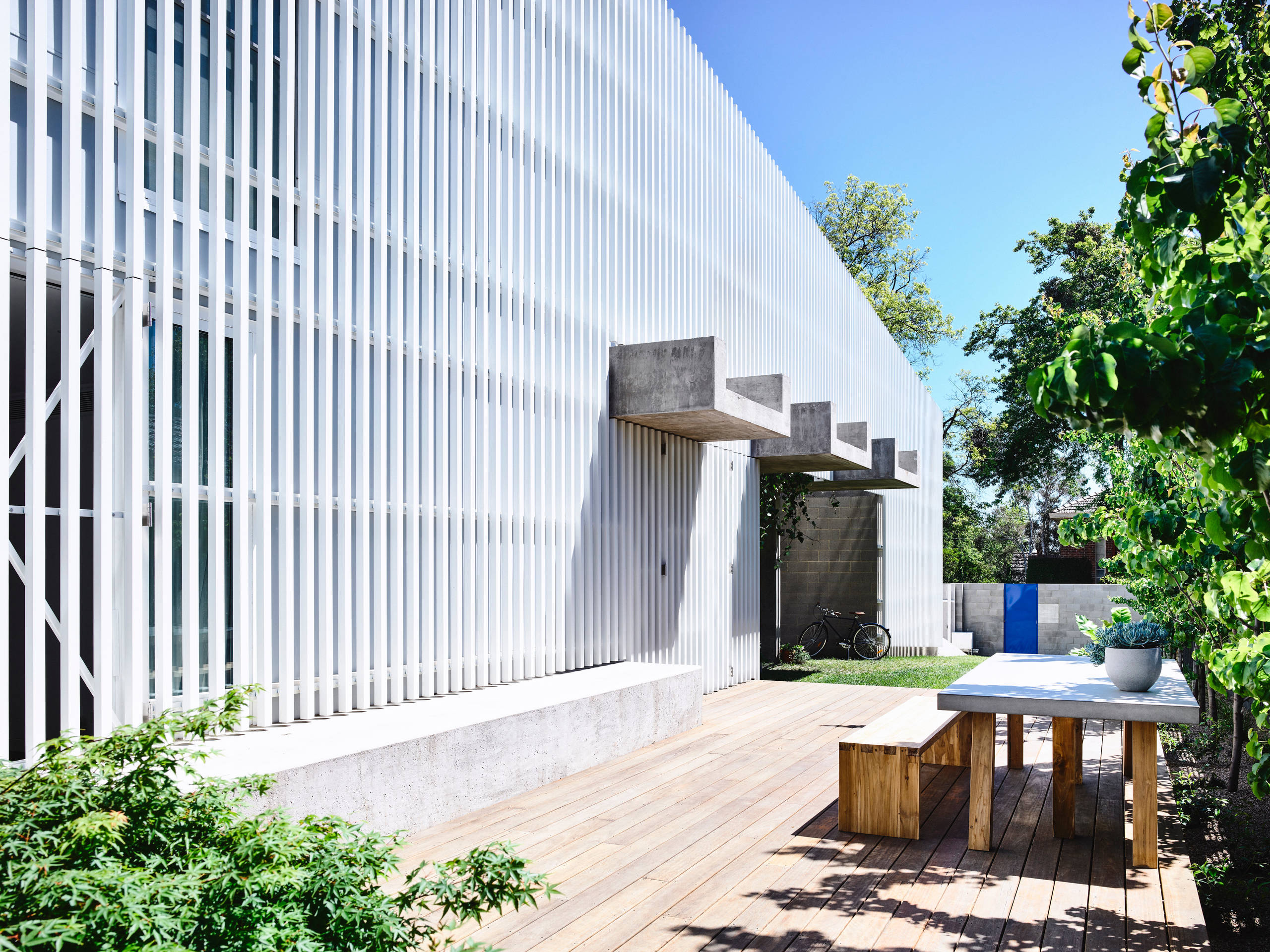 Mo responded to the couple’s brief for privacy and “showing nothing” by designing a series of white aluminium slats that lend the house a strong linearity and shield it like a skin. From the inside, the aluminium screen lets natural light permeate the interior and offers diffused views back to the street. From the outside, it sets a rhythm to which the rest of the site plays.