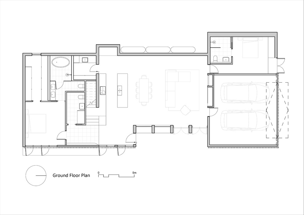 Once you’ve crossed the front threshold, this home takes on an entirely different attitude: the interior is as open as the exterior is closed. Step inside and the design immediately goes from concealing itself to revealing its mass in a cavernous, open-plan layout.