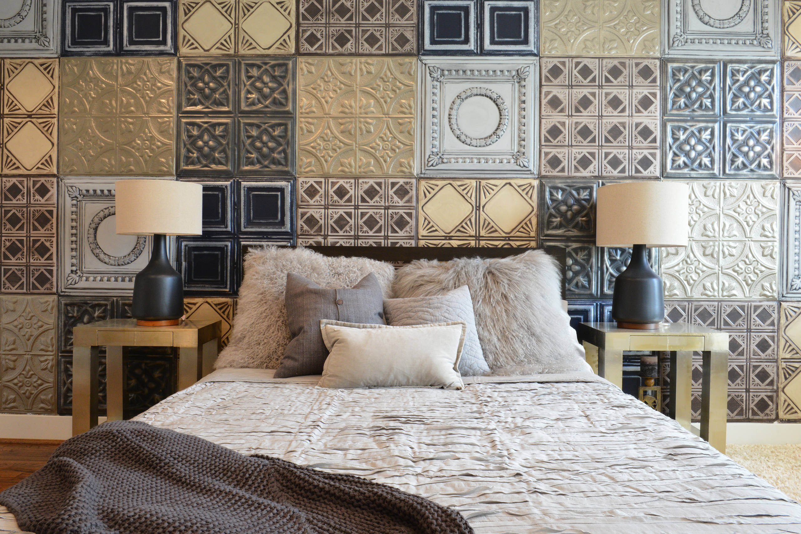 Inexpensive ceiling tiles were used to create a striking and inexpensive accent wall that also moonlights as a bedhead