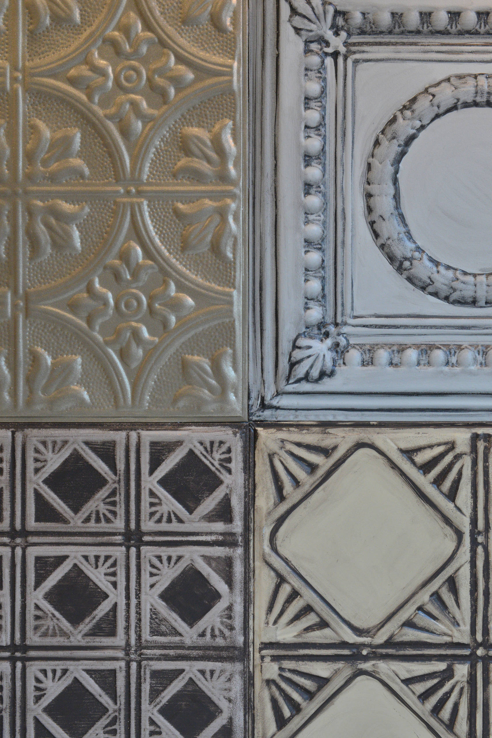 She purchased unfinished tin tiles from The American Tin Ceiling Company. From there, she had a painter finish each tile. The tiles are affixed to the wall with tin tile glue.