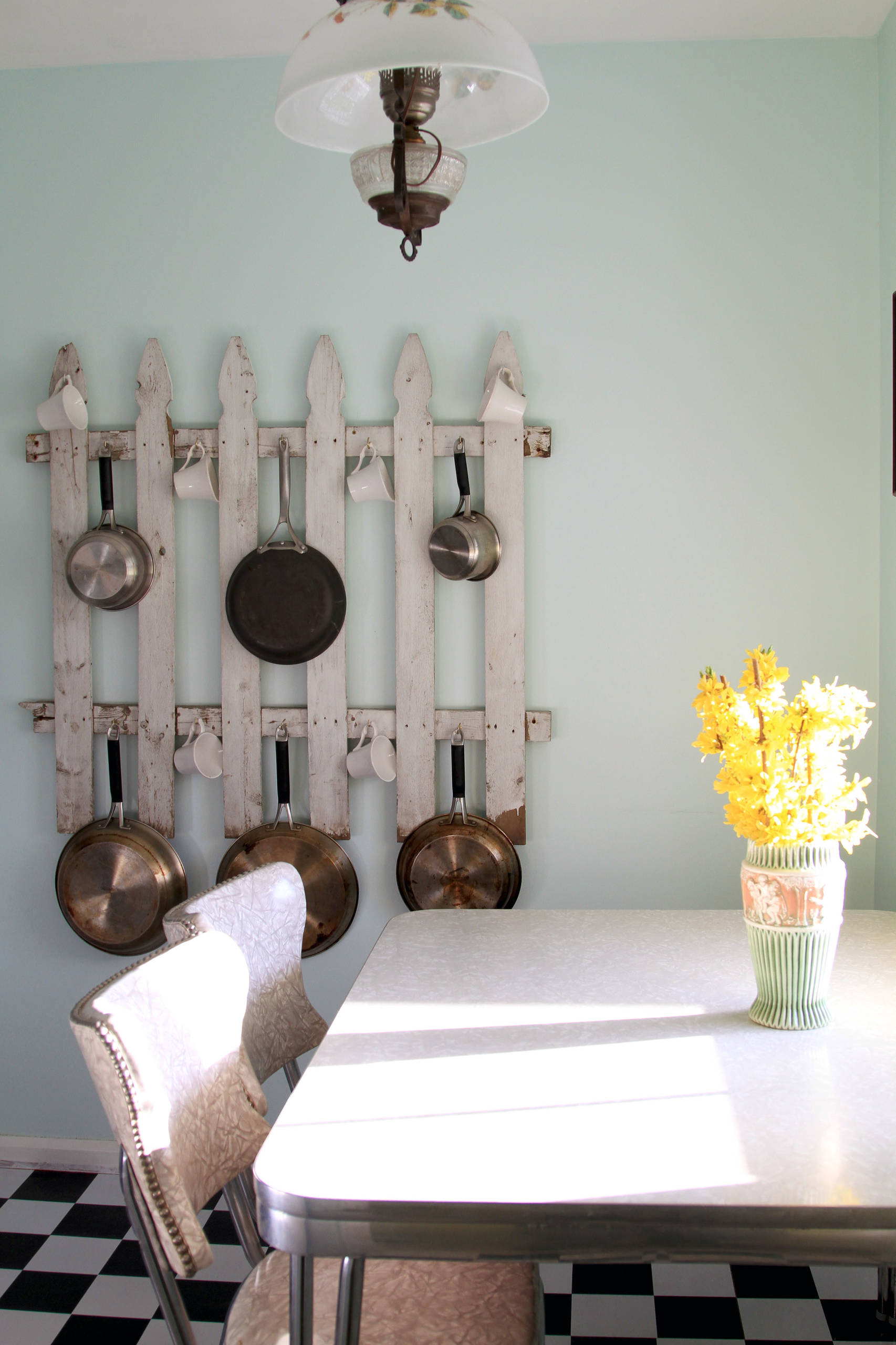 I’ve seen pot racks fashioned from old wooden window frames (without the glass), doors and ladders for a charming, one-of-a-kind storage solution.