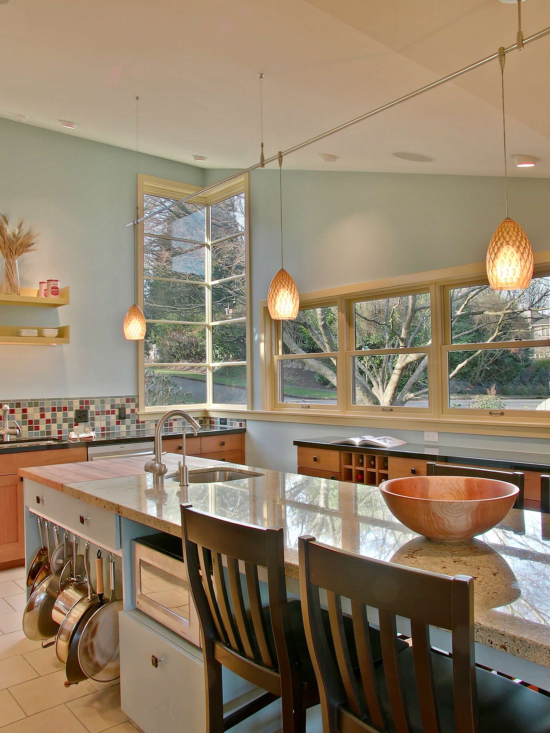 Not sure you want pots and pans hanging prominently, but don’t necessarily want to store them away in a cabinet? Here’s a nice hybrid option – hang your cookware underneath the island.