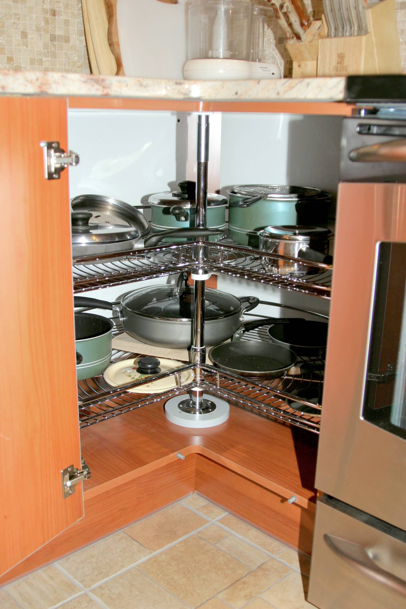 Corner cabinets can be a great storage spot for cookware, especially if outfitted with a wire-rack lazy Susan. You can clearly see everything stored on both shelves, and then spin the rack to access whatever you need.