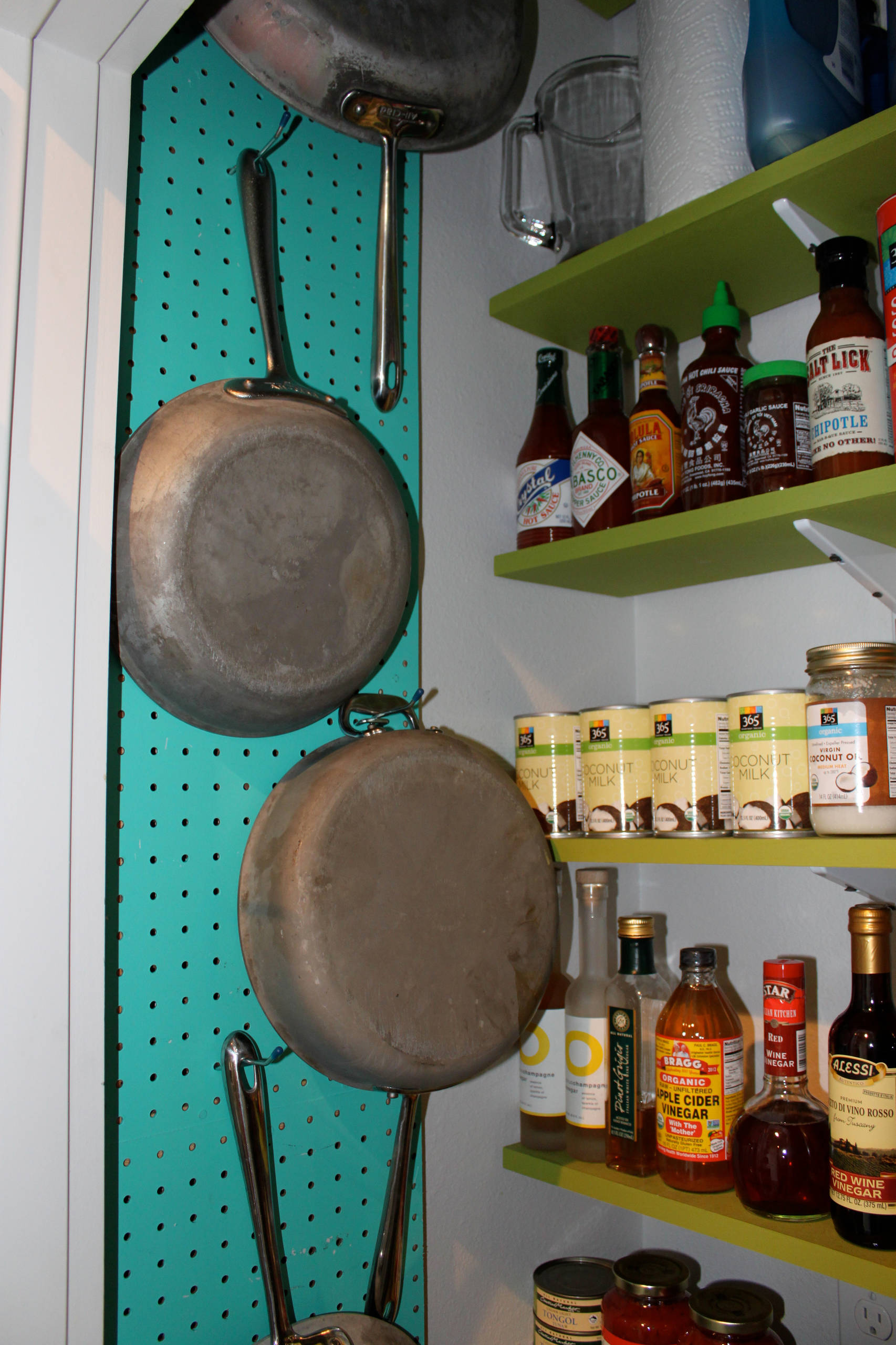 Here’s my own solution to storing cookware. My pots are stored in deep drawers in a base cabinet, and my pans are hung on a pegboard inside my pantry.