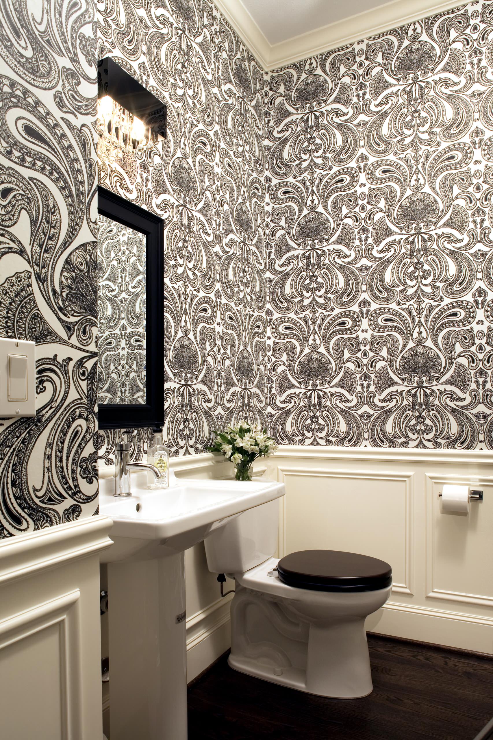The black and white commode complements the bold, eclectic paisley wallpaper in here.
