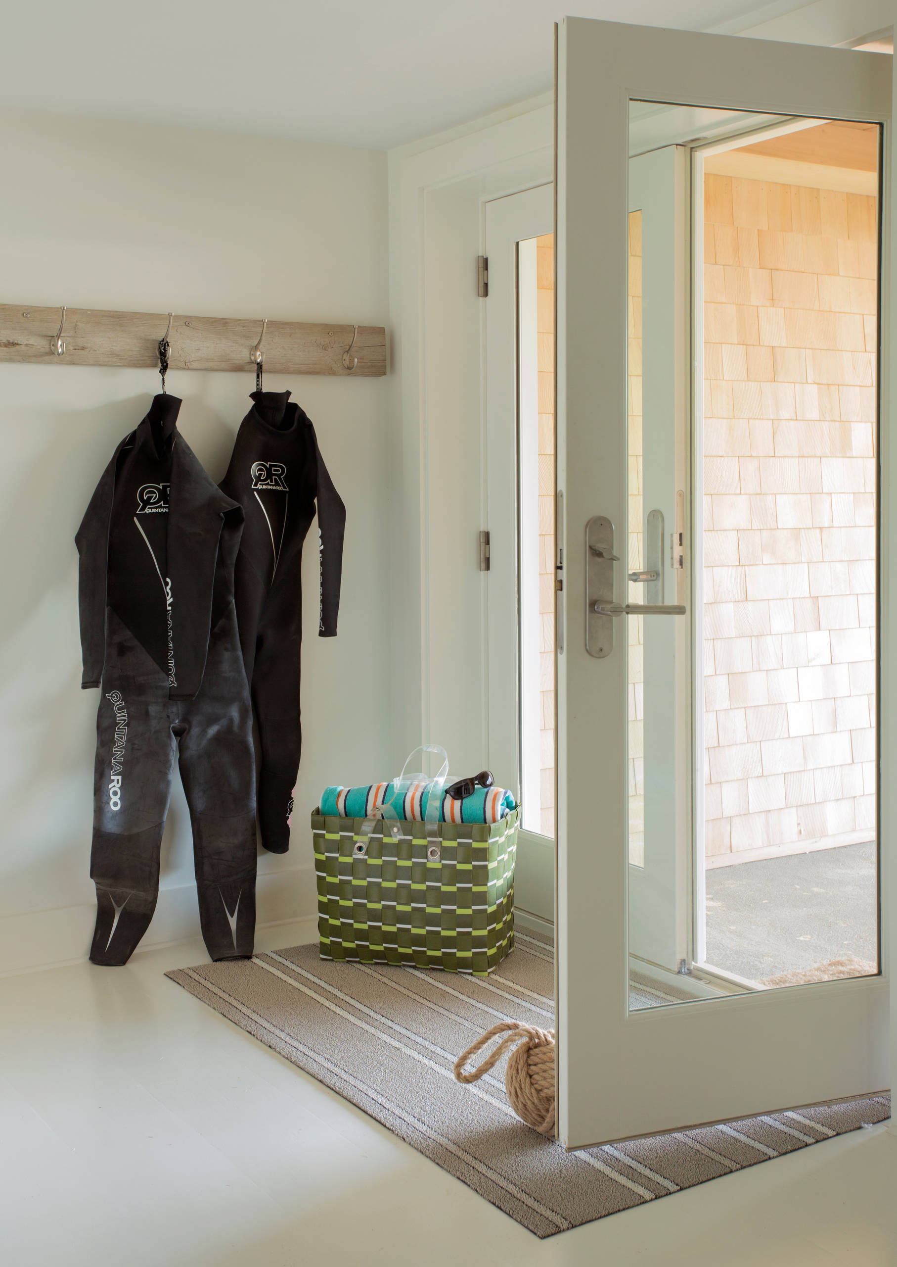 In a service room that you can access from outside, such as a laundry, create an area where you can corral used beach gear. Put up lots of hooks for wet towels and swimsuits, as well as somewhere to stow sandy footwear.