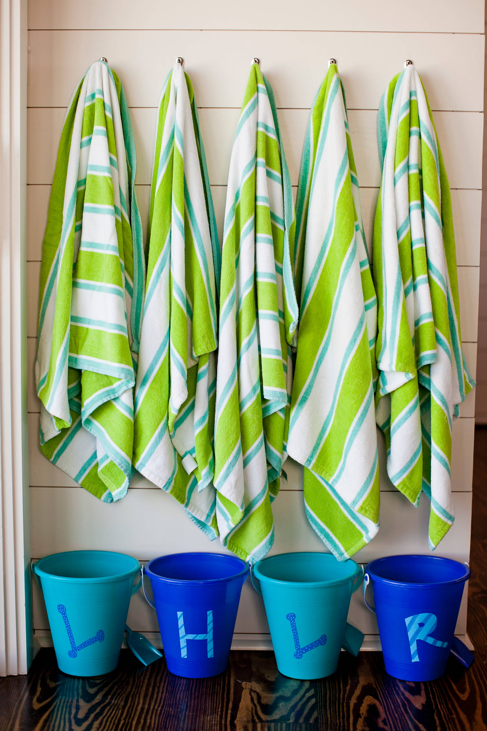 Buckets or plastic tubs are fantastic for throwing wet, sandy kit into, particularly for little ones. Teach them that if it’s wet and sandy, it goes in the plastic tub. Then, when they’re old enough or tall enough, they can hang up the wet gear themselves.