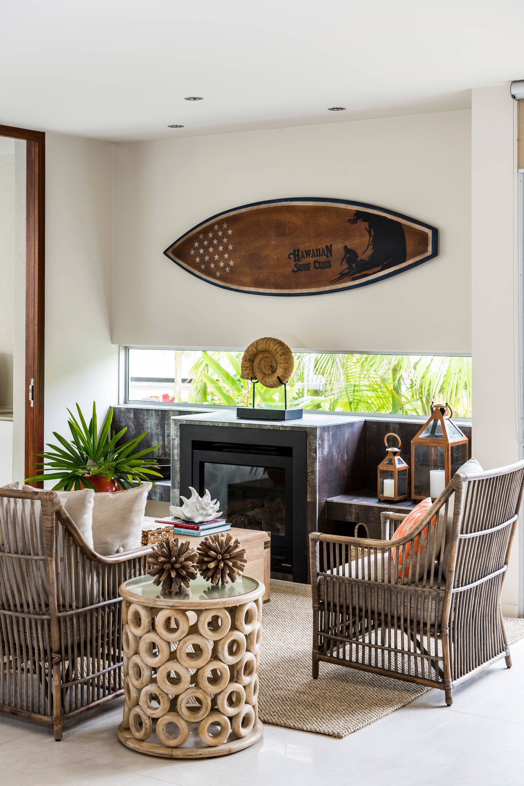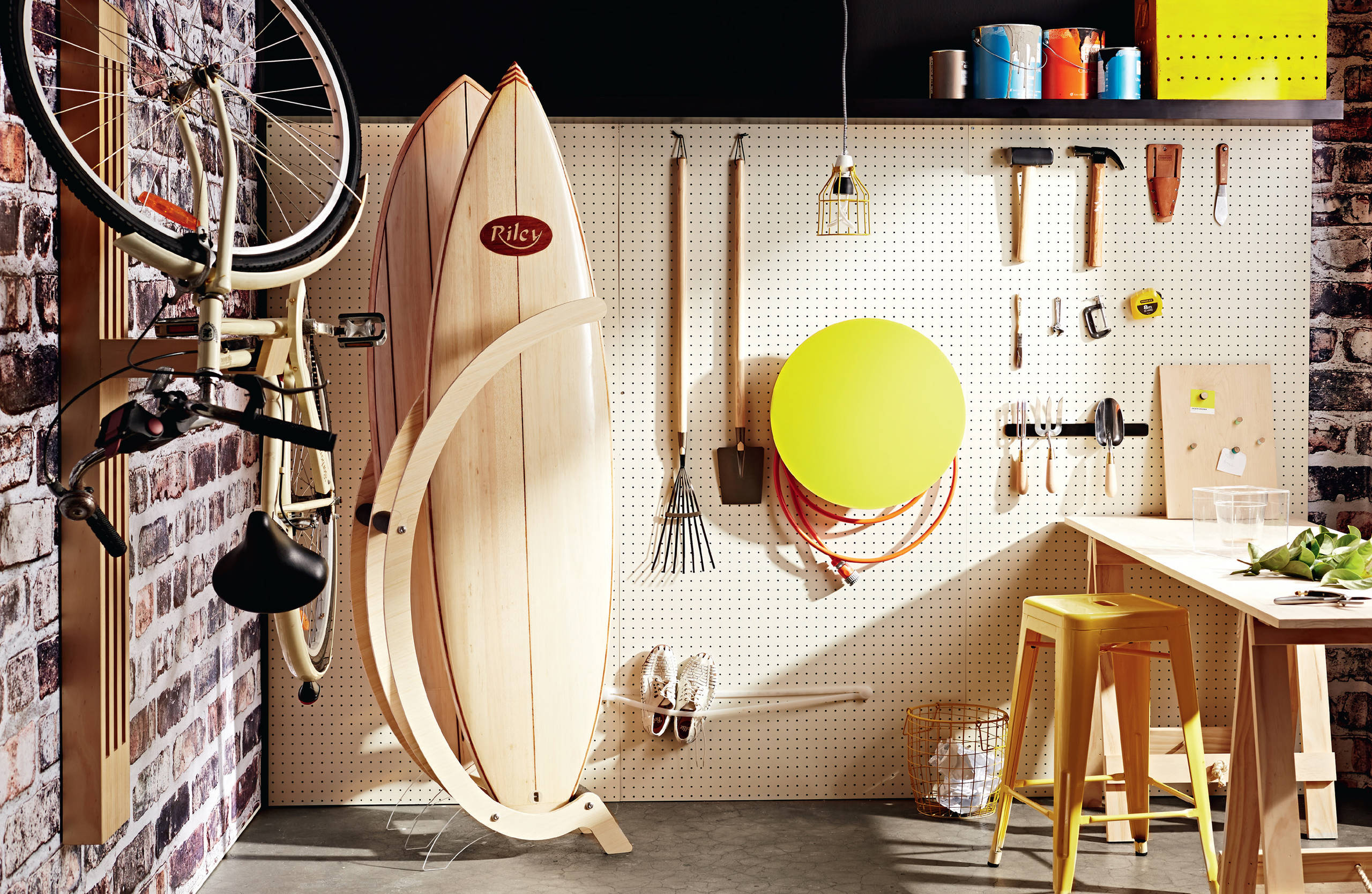 TIP: Install a pegboard wall with hooks and pins for keeping surfing gear off the floor.