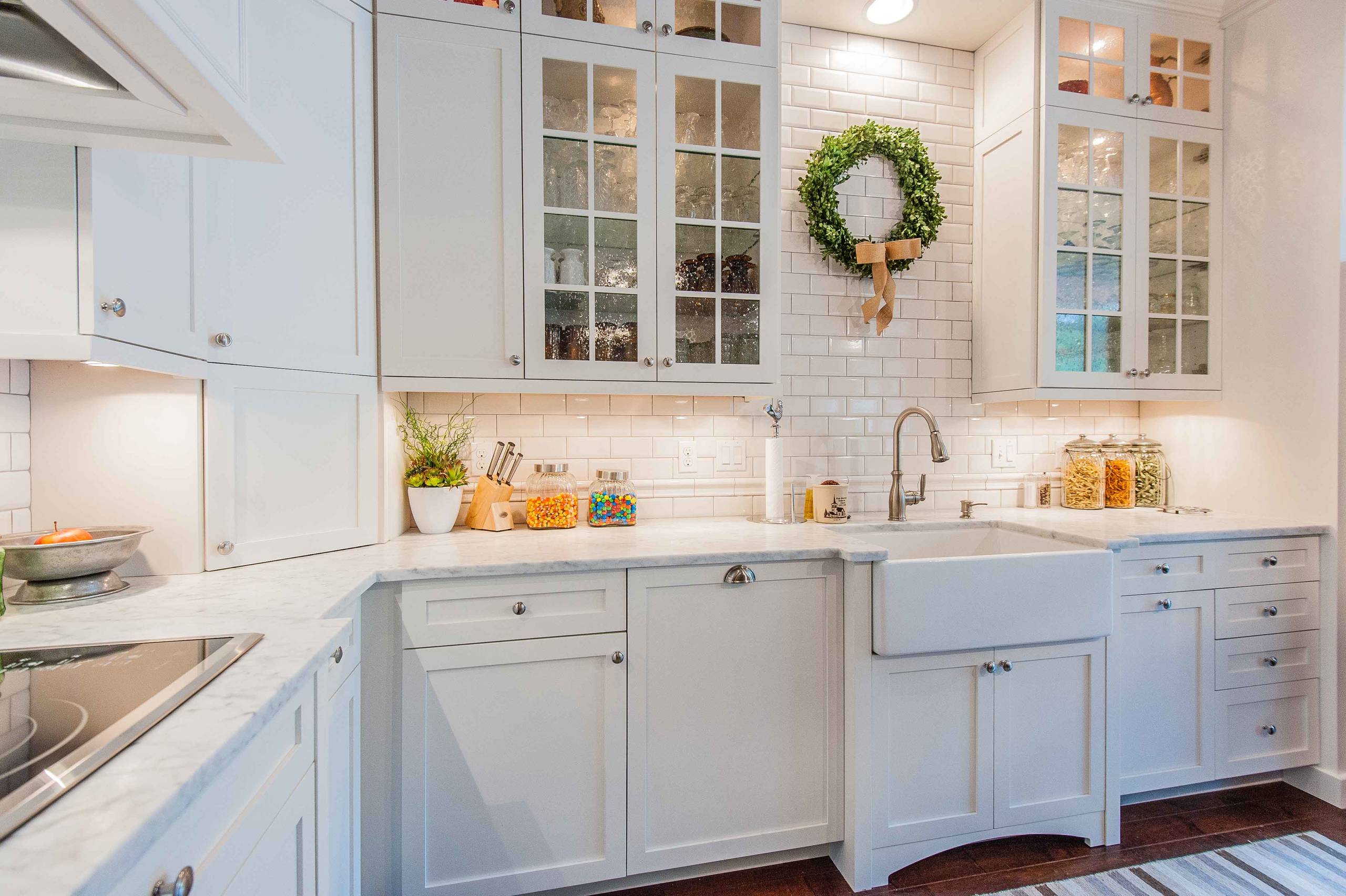 There are so many ways to bring focus to a windowless sink. One of the simplest is to tile the wall behind the sink to the ceiling and just leave it blank. No cabinet, no shelf, no anything … well, maybe a simple wreath, as in this photo, or a piece of art. Whatever you decide, the beauty of this blank-slate solution is that you can change the look whenever the mood strikes. That’s really what good design is all about: it’s always evolving.