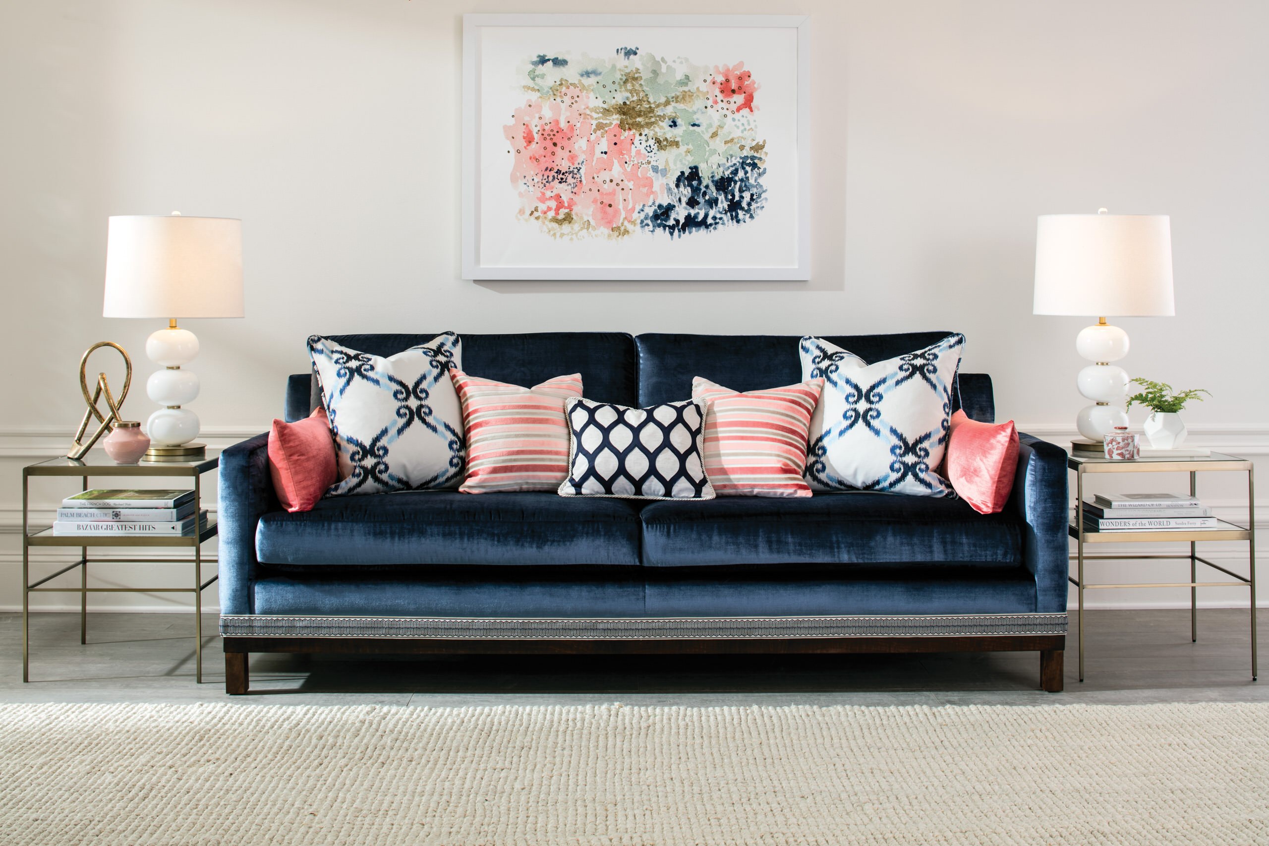 This image shows how these trends can be combined in a way that has longevity (the navy-blue sofa) and fun references to a more relaxed aesthetic (floral artwork and a mix of cushions). Notice how it makes a lighthearted nod to ’80s style without being a slave to that very expressive era.