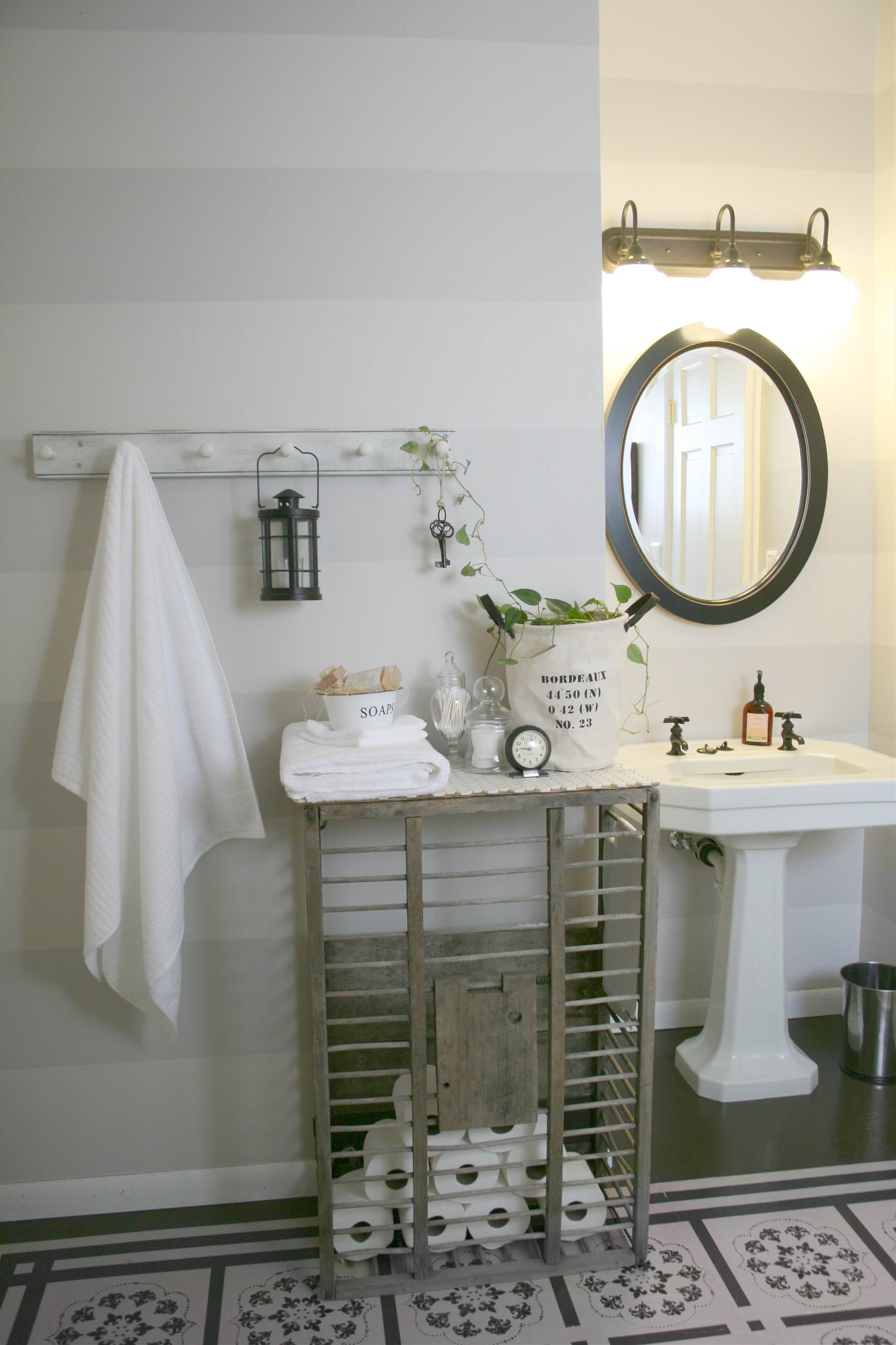 This old cage was found at a garage sale and cleaned up to become a fitting feature in this country-style bathroom. A glass-fronted old cabinet could work just as well.
