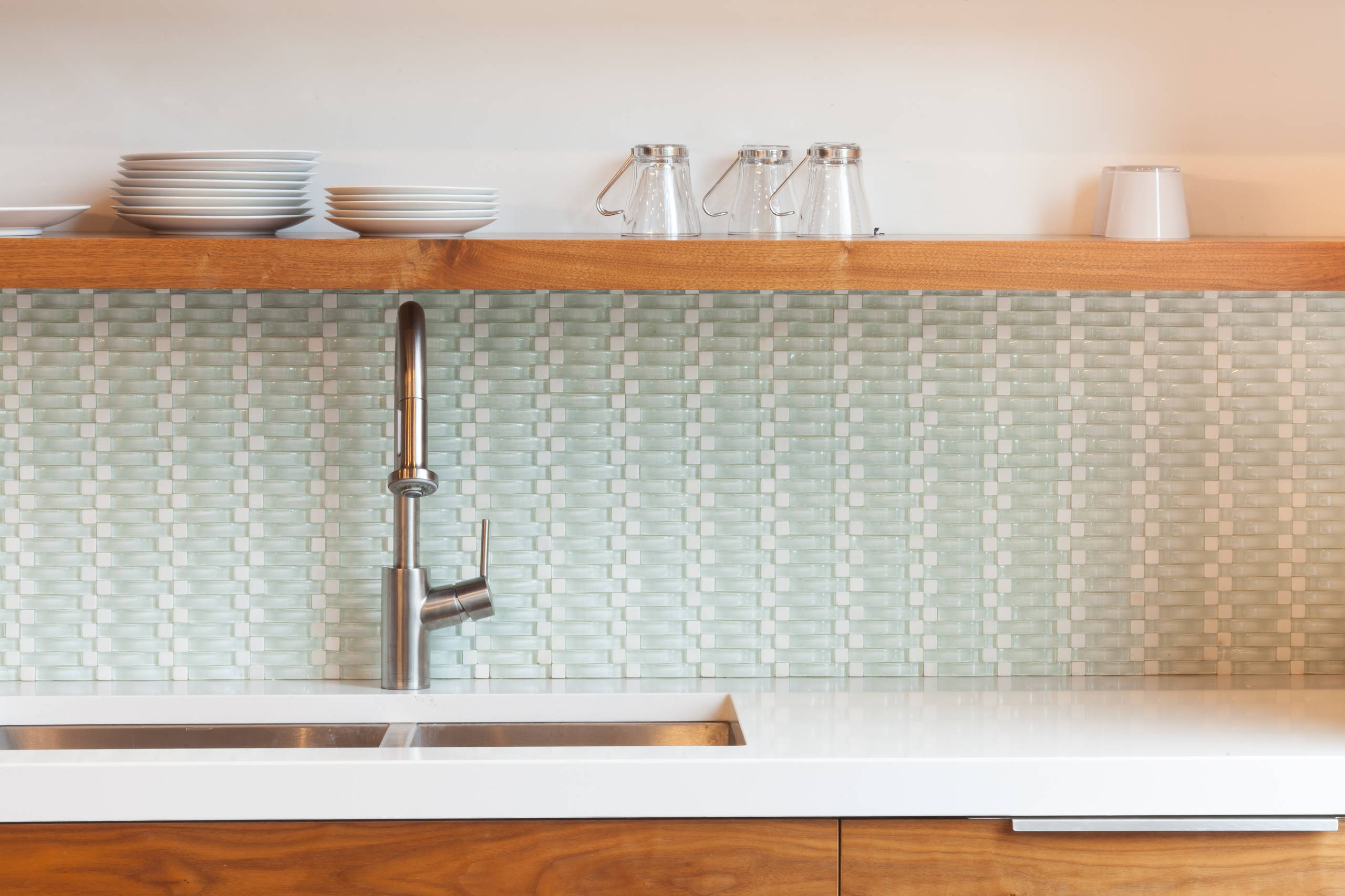 In general, mosaic makes a great counterpoint to larger tiles, because the dramatic shift in scale makes the mismatch clearly intentional. (Here a hexagonal mosaic beautifully contrasts oversize Corian planks.)