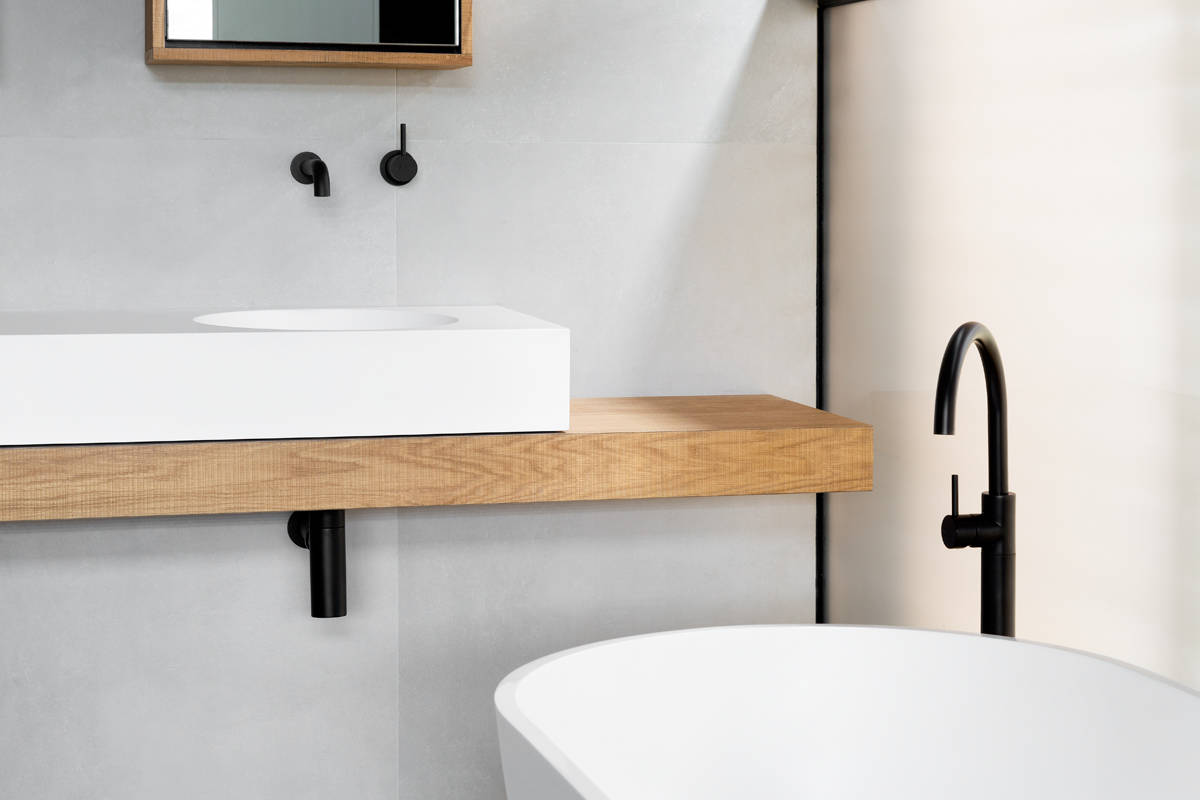 Balance a sleek and contemporary bathroom with some warm wood. Smooth black tapware beautifully complements the grain and texture of natural wood, creating a subtle yet edgy look.