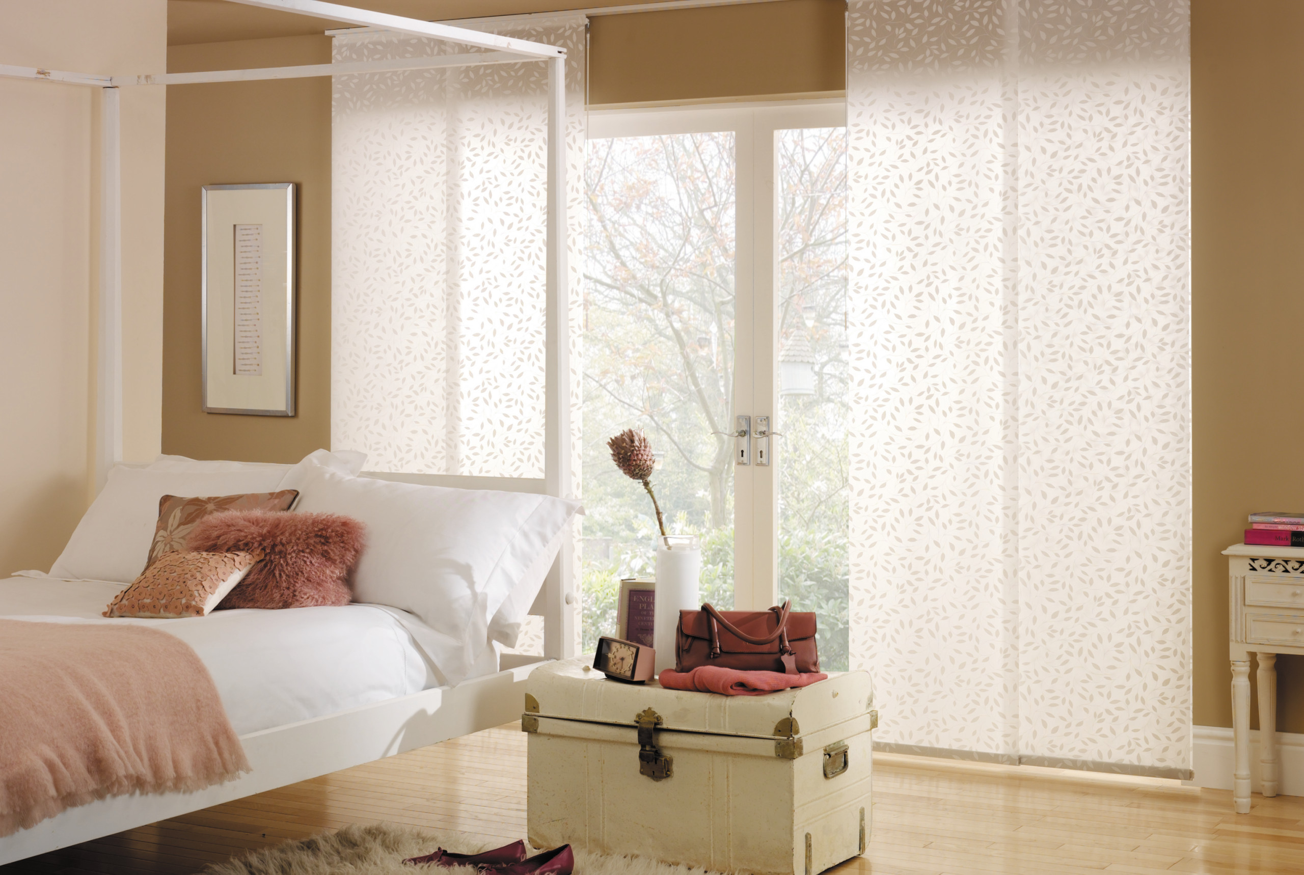 The good thing about fabric panels is that, unlike curtains, they sit flat against the window when drawn and the wall when pulled back, saving space both visually and literally – a real boost in a small room, such as a bedroom.