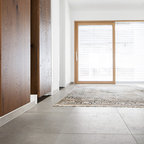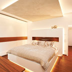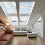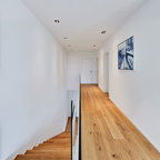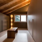 This is an example of a mid-sized modern gender-neutral dressing room in Stuttgart with flat-panel cabinets, white cabinets, medium hardwood floors and brown floor. — Houzz