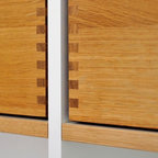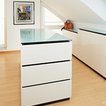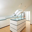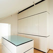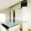 Dieses Ankleidezimmer ist in einer weißen Hochglanzlackierung mit schwarzen Schattenfugen hergestellt. Eine farbige Glasplatte und Griffmulden stellen weitere Bestandteile dar. Die Kleiderschränke sind mit Schiebetüren, Drehtüren sowie Schubladen versehen.