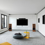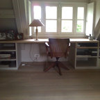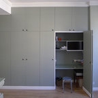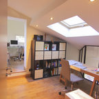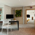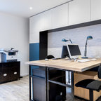 Inspiration for a large contemporary study room in Paris with white walls, carpet, a freestanding desk, no fireplace and grey floor. — Houzz