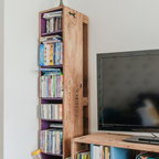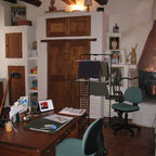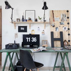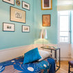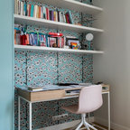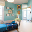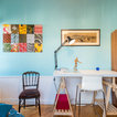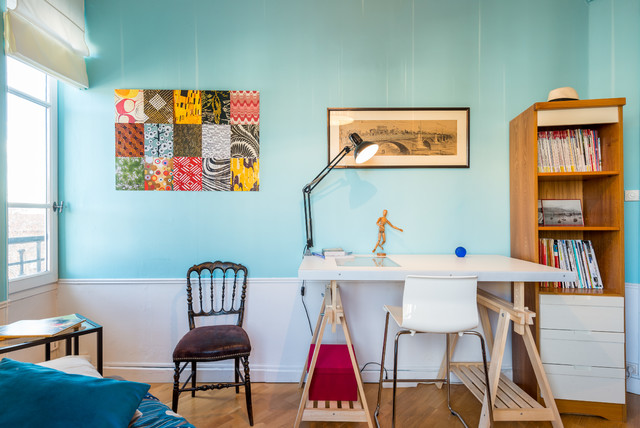 Photo of a mid-sized eclectic study room in Lyon with blue walls, medium hardwood floors, no fireplace and a freestanding desk. — Houzz