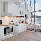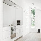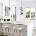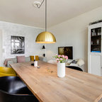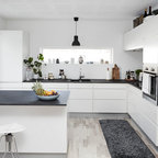 Scandinavian kitchen/dining combo in Aalborg with beige floor, white walls and light hardwood floors. — Houzz