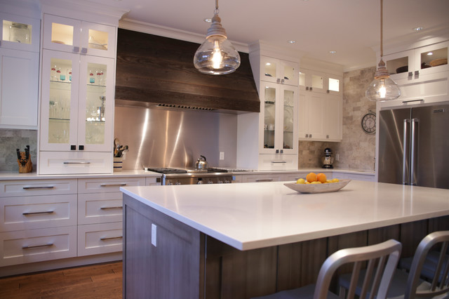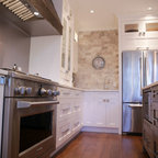 Design ideas for a traditional u-shaped eat-in kitchen in Vancouver with an undermount sink, shaker cabinets, white cabinets, quartz benchtops, beige splashback, stone tile splashback and stainless steel appliances. — Houzz