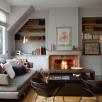 Inspiration for a large contemporary enclosed living room in Paris with a library, beige walls, medium hardwood floors, a corner fireplace, a stone fireplace surround and a freestanding tv. — Houzz