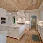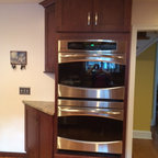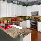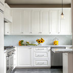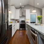 Photo of a mid-sized transitional l-shaped separate kitchen in St Louis with an undermount sink, recessed-panel cabinets, grey cabinets, granite benchtops, beige splashback, porcelain splashback, stainless steel appliances, ceramic floors, with island and grey floor. — Houzz
