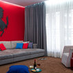 Inspiration for a contemporary home office in Mumbai with red walls, dark hardwood floors and a freestanding desk. — Houzz