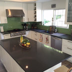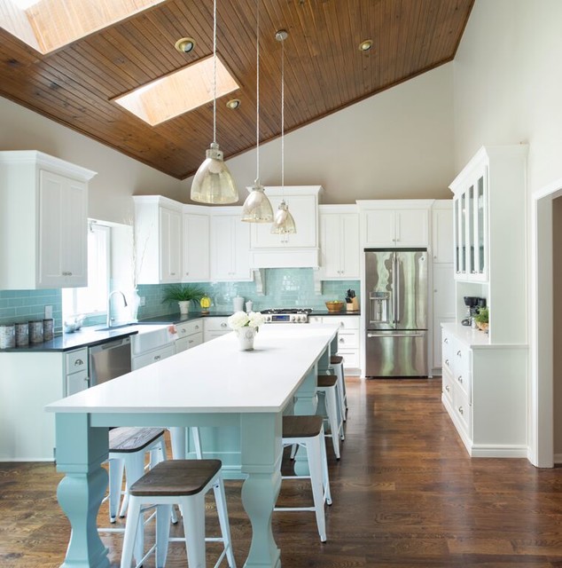 Transitional u-shaped kitchen in Kansas City with a farmhouse sink, flat-panel cabinets, white cabinets, quartz benchtops, blue splashback, glass tile splashback, stainless steel appliances and with island. — Houzz