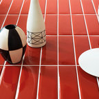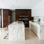 This is an example of a contemporary galley kitchen in Melbourne with with island, a double-bowl sink, flat-panel cabinets, black cabinets, white splashback, beige floor and white benchtop. — Houzz