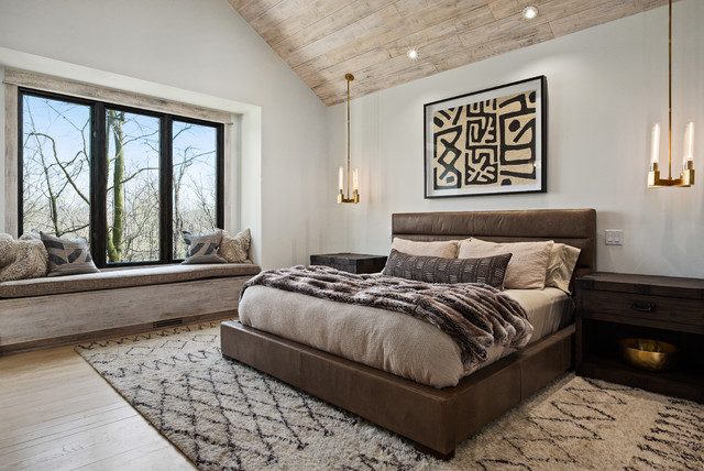 Design ideas for a mid-sized modern master bedroom in Kansas City with beige walls, light hardwood floors, a standard fireplace and a tile fireplace surround. — Houzz