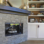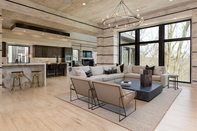 Large modern open concept living room in Kansas City with beige walls, light hardwood floors and a two-sided fireplace. — Houzz