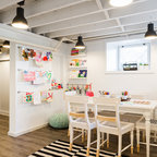 Basement idea. Keep ceilings exposed yet paint white. Nice drop down lights.